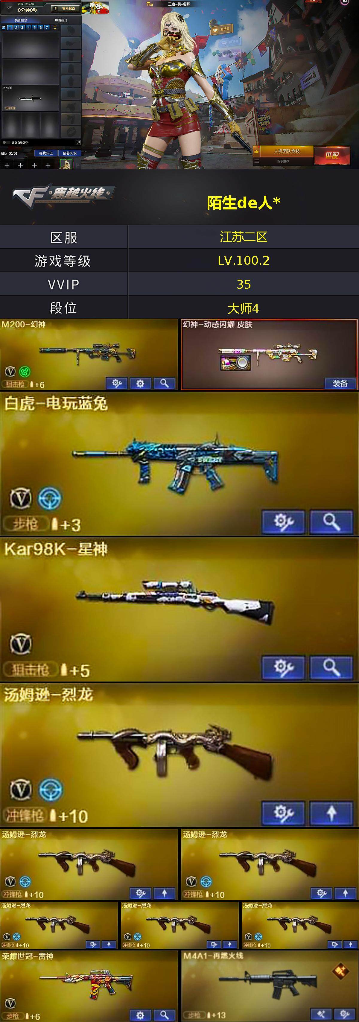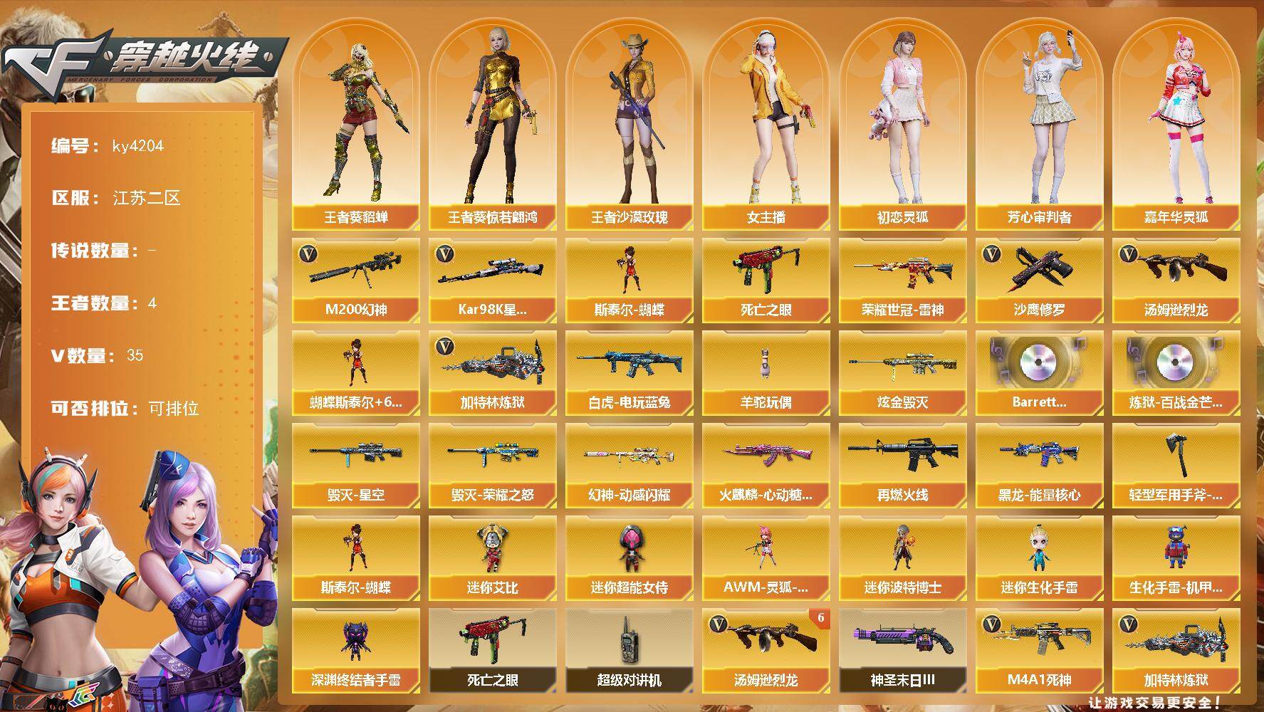 [15246420]江苏二区-35V-4王者-1炫金 【热门武器】:M200-幻神,死亡之眼,荣耀世冠-雷神,白虎-电玩蓝兔,Kar98K-星神,汤姆逊-烈龙*6,加特林-炼狱,斯泰尔-蝴蝶,羊驼玩偶,沙鹰-修罗 【王者炫金武器】:炫金毁灭 【音效卡】:Barrett-碧霄极光音效卡,炼狱-百战金芒-庆典舞曲音效卡 【皮肤】:幻神-动感闪耀 皮肤,M4A1-再燃火线,火麒麟-心动糖果,毁灭-荣耀之怒,毁灭-星空,黑龙-能量核心,轻型军用手斧-再燃火线 【角色】:王者-葵-貂蝉,王者葵-惊若翩鸿,王者沙漠玫瑰,初恋灵狐,芳心审判者,嘉年华灵狐,娟娟,灵狐者-X,麻雀,女主播,潘多拉-X,斯沃特-X 【人偶武器】:斯泰尔-蝴蝶,AWM-灵狐-15周年嘉年华*2,迷你波特博士,迷你生化手雷,生化手雷-机甲核心,深渊终结者手雷,迷你艾比,迷你超能女侍 【暴走生化】:死亡之眼,超级对讲机 【挑战大师】:神圣爆裂者-末日III 【英雄级武器】:AK47-火麒麟*2,M4A1-死神,AK47-黑武士,无影-神兵利器,黑武士-锦绣游龙,AK-47-猩红传说*2,白虎-电玩蓝兔,荣耀世冠-雷神,Barrett-毁灭,M200-幻神,Kar98K-星神,王者森决-觉醒版,加特林-炼狱,炼狱-百战金芒,汤姆逊-烈龙*6,沙鹰-修罗,屠龙,麒麟刺-百战金芒,M4A1-赤狱骑士,Barrett-碧霄极光 【道具】:BS战队炫彩背包,云山科技背包,冰冰企鹅背包-猛男专用,女皇终结者-背包,炫彩背包-诺拉,炫彩背包,百战金芒炫彩背包,圣拳猎手-炽雪,女皇终结者-魔龙之吻,救世主-黑桃战神,绿色巨人,灵魂忍者,变异宝贝,迷雾幽灵,生化弹匣,夺命之镰,防化服*3,流光-鎏金之域,语音特效-盛典烟火,萌萌小葵表情,电玩兔兔表情,防弹头盔*4,防弹衣*4,C4工具钳*3,手雷包*4 【特殊枪械】:蝴蝶斯泰尔+6烈龙,6烈龙,1炼狱,1蝴蝶斯泰尔