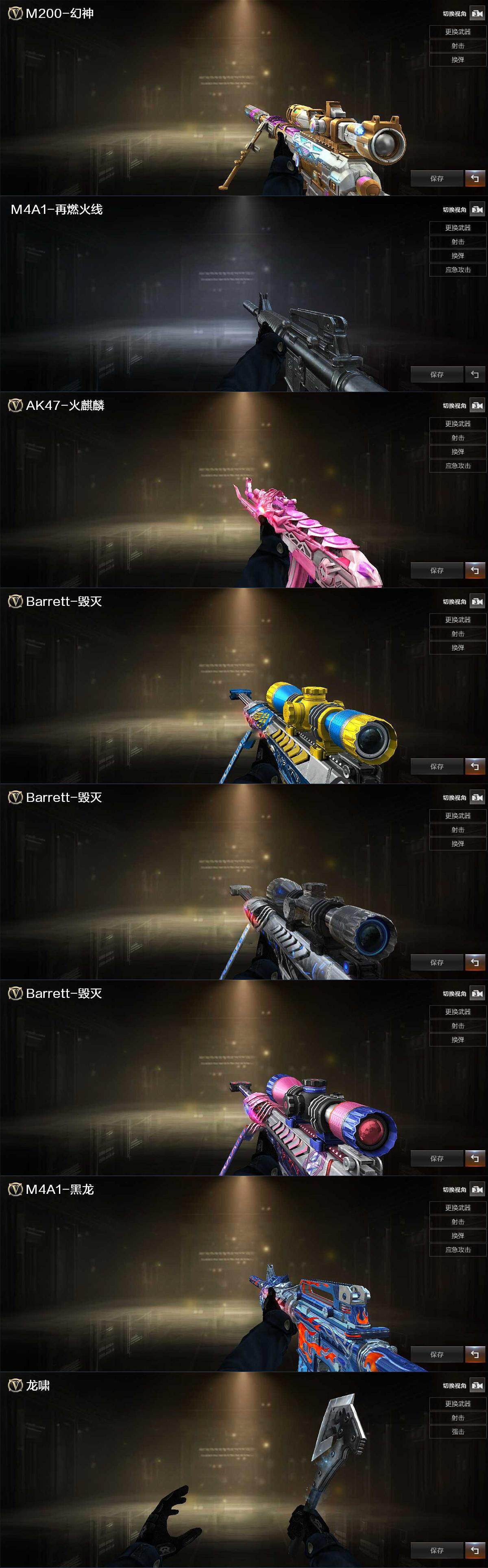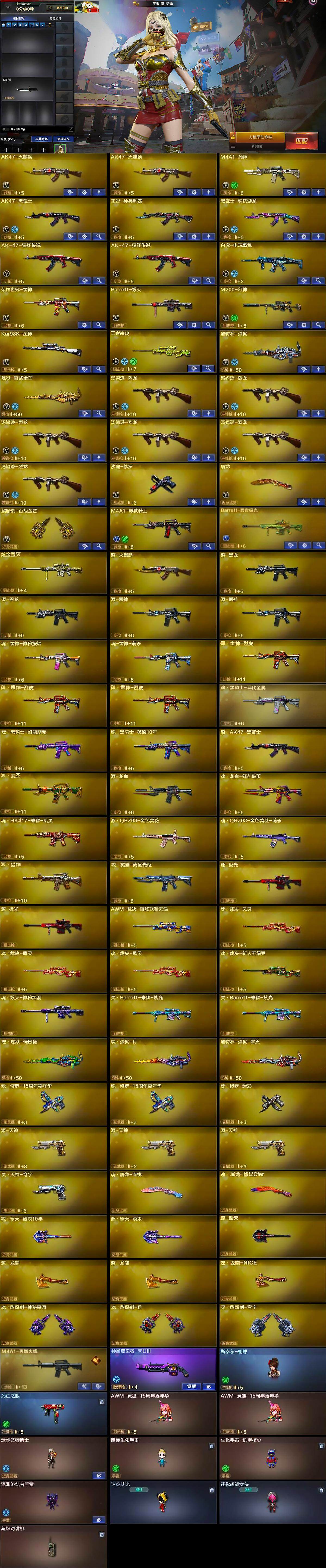 【英雄级武器】:AK47-火麒麟*2,M4A1-死神,AK47-黑武士,无影-神兵利器,黑武士-锦绣游龙,AK-47-猩红传说*2,白虎-电玩蓝兔,荣耀世冠-雷神,Barrett-毁灭,M200-幻神,Kar98K-星神,王者森决-觉醒版,加特林-炼狱,炼狱-百战金芒,汤姆逊-烈龙*6,沙鹰-修罗,屠龙,麒麟刺-百战金芒,M4A1-赤狱骑士,Barrett-碧霄极光