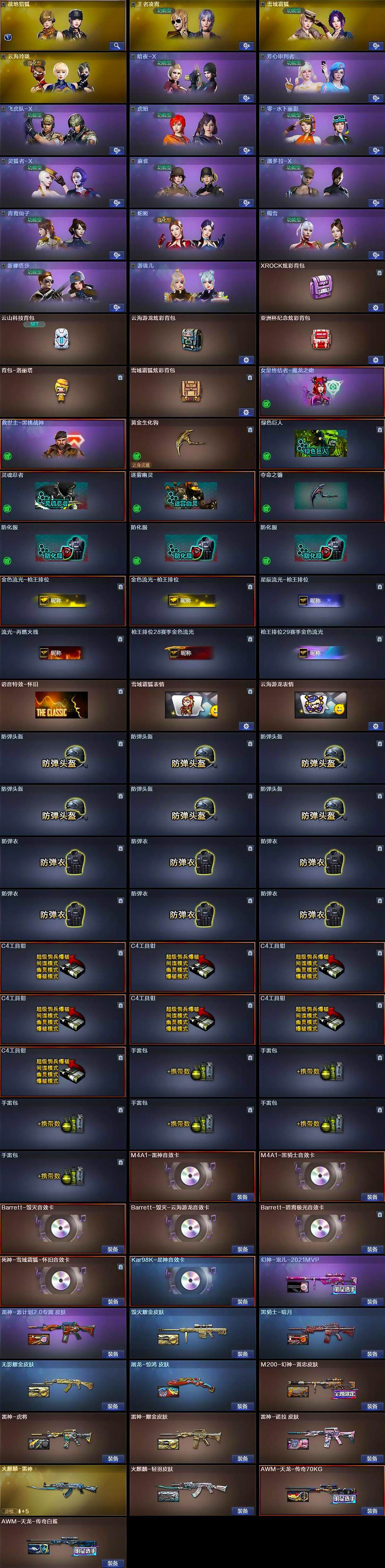 【道具】:XROCK炫彩背包,云山科技背包,云海游龙炫彩背包,亚洲杯纪念炫彩背包,背包-洛丽塔,雪域霜狐炫彩背包,女皇终结者-魔龙之吻,救世主-黑桃战神,黄金生化钩,绿色巨人,灵魂忍者,迷雾幽灵,夺命之镰,防化服*3,金色流光-枪王排位*2,星辰流光-枪王排位,流光-再燃火