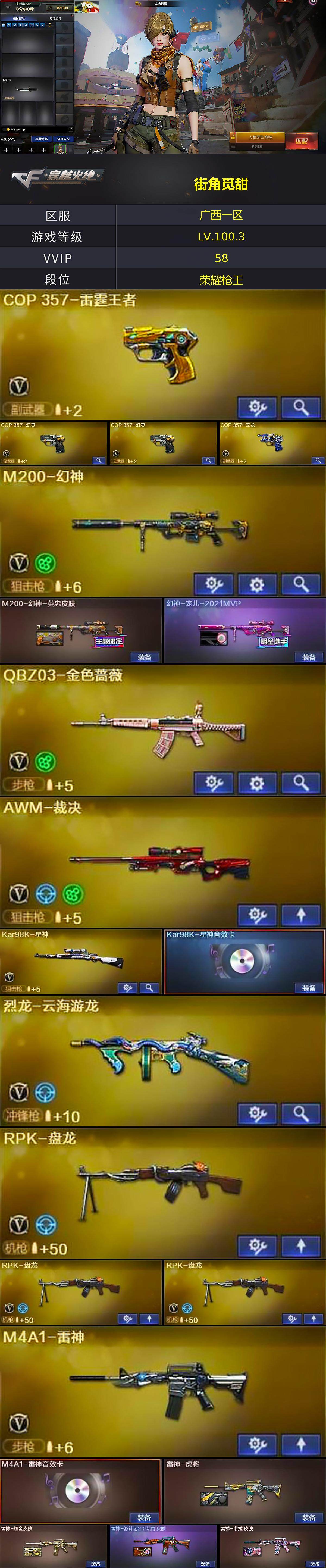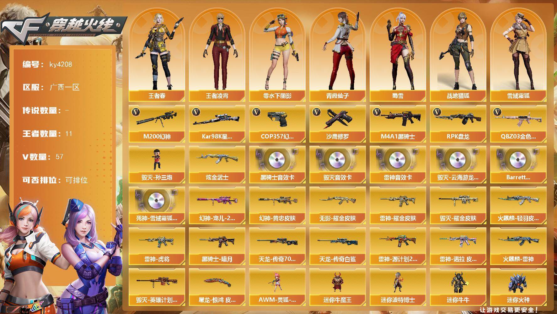 [15246452]广西一区-57V-11王者-1炫金 【热门武器】:QBZ03-金色蔷薇,M200-幻神,Kar98K-星神,M4A1-黑骑士,RPK-盘龙*3,毁灭-孙三炮,COP 357-幻灵*2,沙鹰-修罗*6 【王者炫金武器】:炫金武士 【音效卡】:M4A1-雷神音效卡,M4A1-黑骑士音效卡,Barrett-毁灭音效卡,Barrett-毁灭-云海游龙音效卡,Barrett-碧霄极光音效卡,死神-雪域霜狐-怀旧音效卡 【皮肤】:M200-幻神-黄忠皮肤,幻神-宠儿-2021MVP,雷神-虎将,雷神-耀金皮肤,雷神-源计划2.0专属 皮肤,雷神-诺拉 皮肤,火麒麟-雷神,火麒麟-轻羽皮肤,毁灭耀金皮肤,毁灭-英雄计划 皮肤,黑骑士-暗月,无影耀金皮肤,AWM-天龙-传奇70KG,AWM-天龙-传奇白鲨,屠龙-惊鸿 皮肤 【角色】:战地猎狐,王者春,王者凌霄,雪域霜狐,云海玲珑,暗夜-X,芳心审判者,飞虎队-X,虎妞,疾风,零-水下丽影,灵狐者-X,麻雀,潘多拉-X,青霞仙子,蛇姬,蜀雪,新娜塔莎,游珑儿 【人偶武器】:毁灭-孙三炮,AWM-灵狐-15周年嘉年华,迷你牛魔王,迷你波特博士,迷你牛牛,迷你火种,迷你生化手雷,生化手雷-机甲核心 【挑战大师】:试炼破坏者III,神圣爆裂者-末日III 【英雄级武器】:AK47-火麒麟,M4A1-雷神,M4A1-黑骑士,M4A1-龙血,黑武士-锦绣游龙,死神-雪域霜狐,QBZ03-金色蔷薇,王者之翼-觉醒版,王者之势-觉醒版,AWM-天龙,Barrett-毁灭,Barrett-极光,AWM-裁决,M200-幻神,Kar98K-星神,RPK-盘龙*3,烈龙-云海游龙,沙鹰-修罗*6,COP 357-雷霆王者-觉醒版,COP 357-幻灵*2,COP 357-云龙,王者之魂-觉醒版,屠龙,龙啸*3,麒麟刺,幻灵之锋*2,擎天-云海游龙,高爆手雷-幻灵*6,手雷-云海游龙,闪光弹-幻灵*6,闪光弹-雷霆王者-觉醒版*2,烟雾弹-幻灵*7,M4A1-赤狱骑士,AWM-昌龙 【道具】:XROCK炫彩背包,云山科技背包,云海游龙炫彩背包,亚洲杯纪念炫彩背包,背包-洛丽塔,雪域霜狐炫彩背包,女皇终结者-魔龙之吻,救世主-黑桃战神,黄金生化钩,绿色巨人,灵魂忍者,迷雾幽灵,夺命之镰,防化服*3,金色流光-枪王排位*2,星辰流光-枪王排位,流光-再燃火