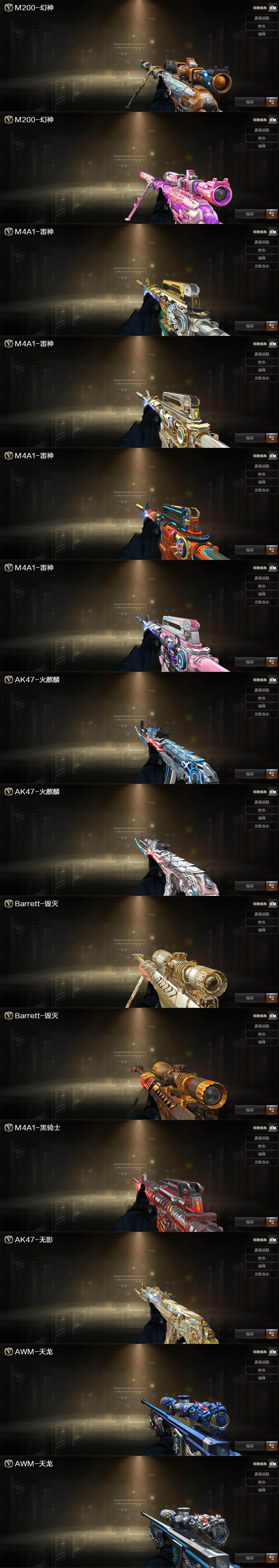 【英雄级武器】:AK47-火麒麟,M4A1-雷神,M4A1-黑骑士,M4A1-龙血,黑武士-锦绣游龙,死神-雪域霜狐,QBZ03-金色蔷薇,王者之翼-觉醒版,王者之势-觉醒版,AWM-天龙,Barrett-毁灭,Barrett-极光,AWM-裁决,M200-幻神,Kar98K-星神,RPK-盘龙*3,烈龙-云海游龙,沙鹰-修罗*6,COP 357-雷霆王者-觉醒版,COP 357-幻灵*2,COP 357-云龙,王者之魂-觉醒版,屠龙,龙啸*3,麒麟刺,幻灵之锋*2,擎天-云海游龙,高爆手雷-幻灵*6,手雷-云海游龙,闪光弹-幻灵*6,闪光弹-雷霆王者-觉醒版*2,烟雾弹-幻灵*7,M4A1-赤狱骑士,AWM-昌龙