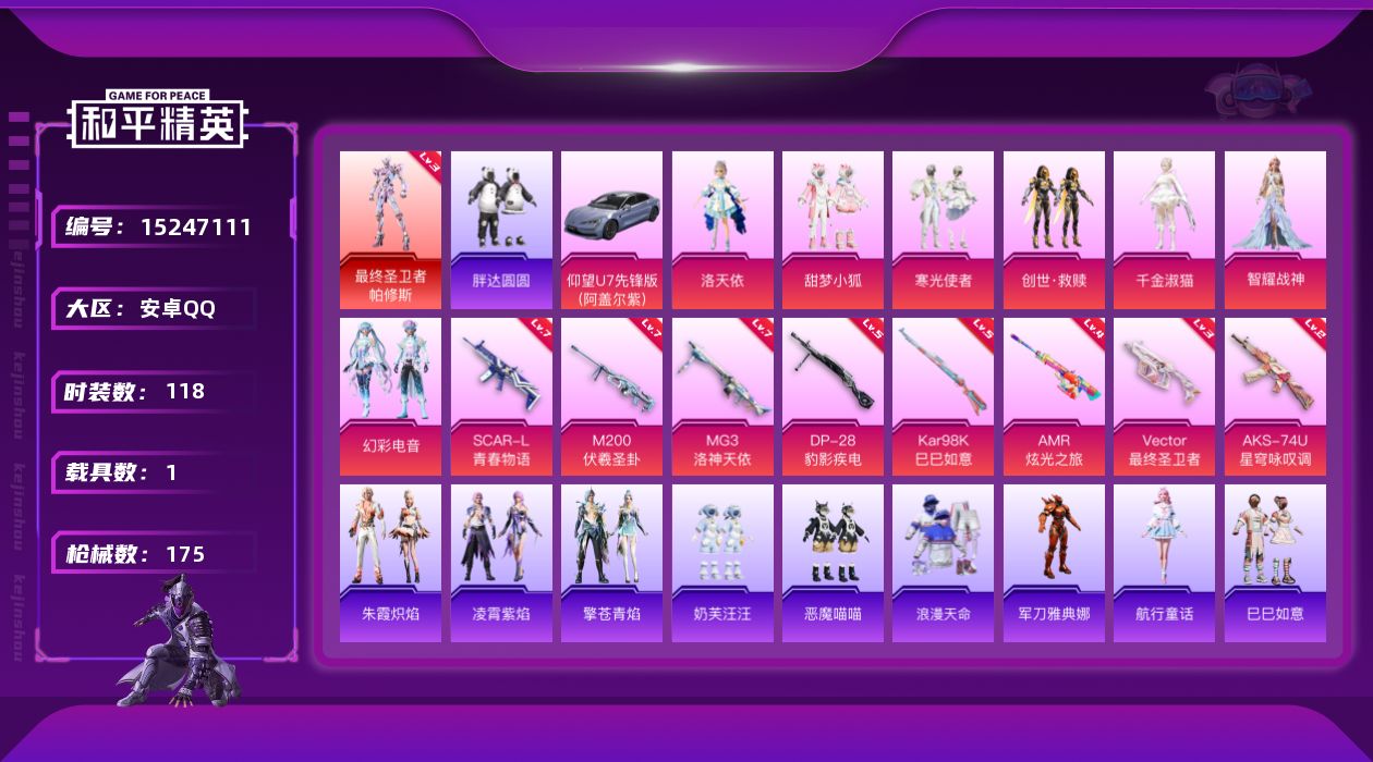 [15247111]素材身法号【特价急出/详情看图】:安卓 手Q-1神装-7粉装-8特效枪-1载具-2粉色飞行器-6w热力值-11王牌印记-118套装-175枪皮【红色神装等级】:最终圣卫者-帕修斯(三级)【热门品类】:套装-浪漫天命,角色-军刀雅典娜,套装-胖达圆圆【粉色载具】:仰望U7(阿盖尔紫)【粉色套装】:角色-洛天依,粉装-甜梦小狐,粉装-寒光使者,套装-创世·救赎,角色-千金淑猫,角色-智耀战神,粉装-幻彩电音【粉色枪皮等级】:SCAR-L-青春物语(七级),Vector-最终圣卫者(三级),AKS-74U-星穹咏叹调(二级),Kar98K-巳巳如意(五级),AMR-炫光之旅(四级),M200-伏羲圣卦(七级),DP-28-豹影疾电(五级),MG3-洛神天依(七级)【粉色飞行器】:天之羽翼飞行器,终晖之翼飞行器