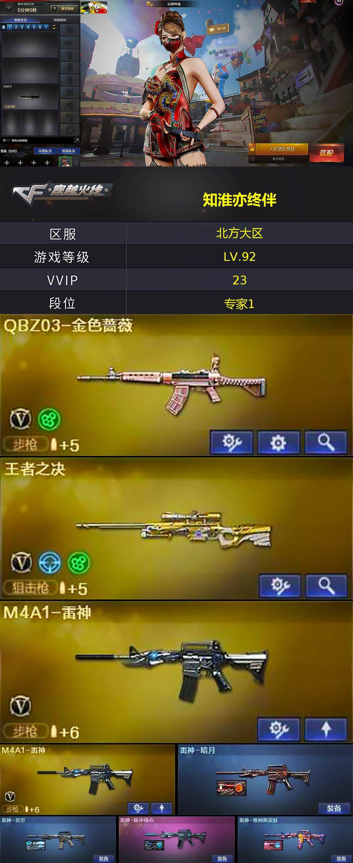 [15247283]北方大区-23V-2王者-1炫金 【热门武器】:QBZ03-金色蔷薇,HK417-朱雀,死亡之眼*2,加特林-炼狱,沙鹰-修罗*2 【王者炫金武器】:炫金无影 【音效卡】:Barrett-毁灭音效卡 【皮肤】:雷神-暗月,雷神-星空,雷神-脉冲核心,雷神-维纳斯皮肤,火麒麟-冠军之心,火麒麟-平天大圣,火麒麟-百城*2,火麒麟-心动糖果,毁灭-星空,毁灭-战神张飞,毁灭-黑大圣皮肤,M4A1-千变-孔明皮肤,天龙-能量核心,屠龙-春桃 皮肤 【角色】:云海玲珑,芳心审判者,风暴女,嘉年华灵狐,0号玩家,灵狐-花神,龙儿,曼陀罗-礼服,玫瑰花神,娜塔莉娅,潘多拉-甜心教官,潜龙队-X,青霞仙子,斯沃特-X,蜀雪,兔囡囡,夜玫瑰-幻能朋克,樱-战斗天使,职业选手 【人偶武器】:AWM-灵狐-15周年嘉年华,生化手雷-机甲核心*3,灵狐娃娃手雷*2 【暴走生化】:死亡之眼*2 【挑战大师】:AK47-冰龙粉碎者,激光毁灭者III*2,神圣爆裂者-末日III*2 【英雄级武器】:M4A1-千变,AK47-火麒麟,M4A1-雷神*2,AK12-天启,AK47-黑鲨,HK417-朱雀,无影-神兵利器,M4A1-玫瑰精灵,QBZ03-金色蔷薇,王者之势-觉醒版,AWM-天龙,Barrett-毁灭,Barrett-金色蔷薇,王者之决-觉醒版,加特林-炼狱,沙鹰-修罗*2,修罗-云海游龙,屠龙,擎天-云海游龙,屠龙-云海游龙,手雷-云海游龙 【道具】:KZ战队炫彩背包,云山科技背包,炫彩背包,绿色巨人,灵魂忍者,迷雾幽灵,生化弹匣,夺命之镰,防化服*3,金色流光-枪王排位*2,星辰流光-枪王排位,枪王排位28赛季金色流光,云海游龙表情,防弹头盔*7,防弹衣*7,C4工具钳*7,手雷包*7 【特殊枪械】:1炼狱