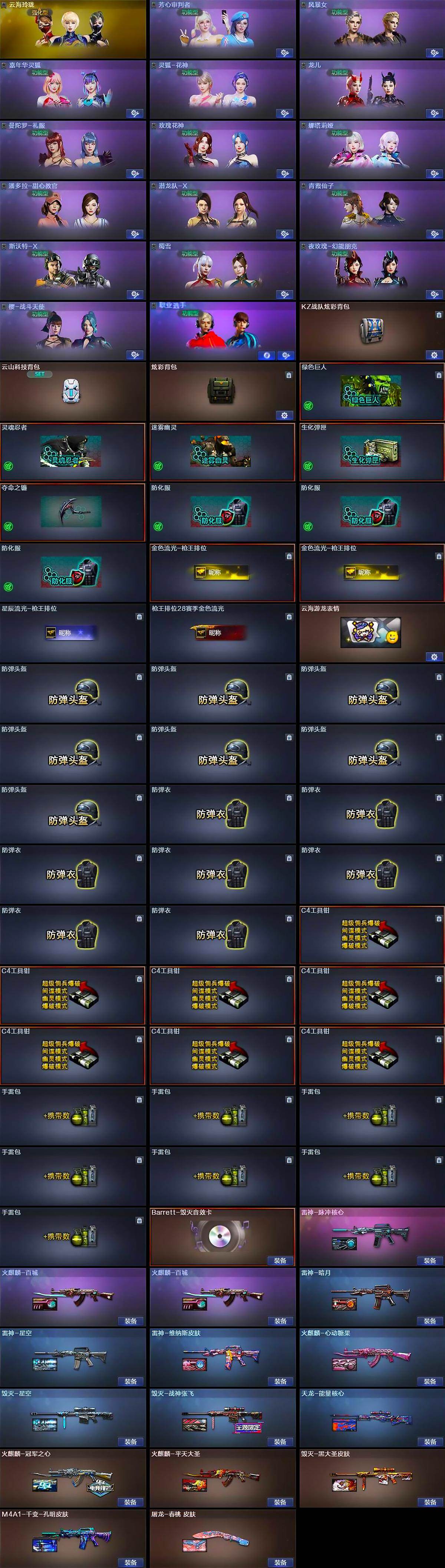 【道具】:KZ战队炫彩背包,云山科技背包,炫彩背包,绿色巨人,灵魂忍者,迷雾幽灵,生化弹匣,夺命之镰,防化服*3,金色流光-枪王排位*2,星辰流光-枪王排位,枪王排位28赛季金色流光,云海游龙表情,防弹头盔*7,防弹衣*7,C4工具钳*7,手雷包*7