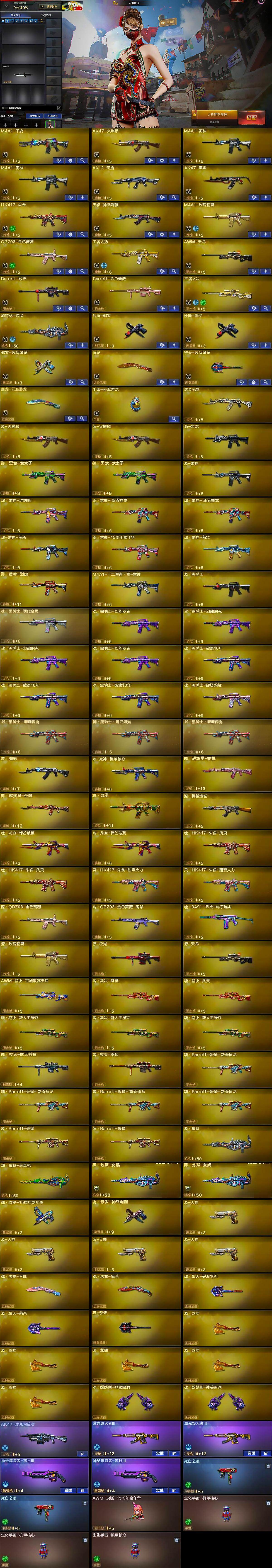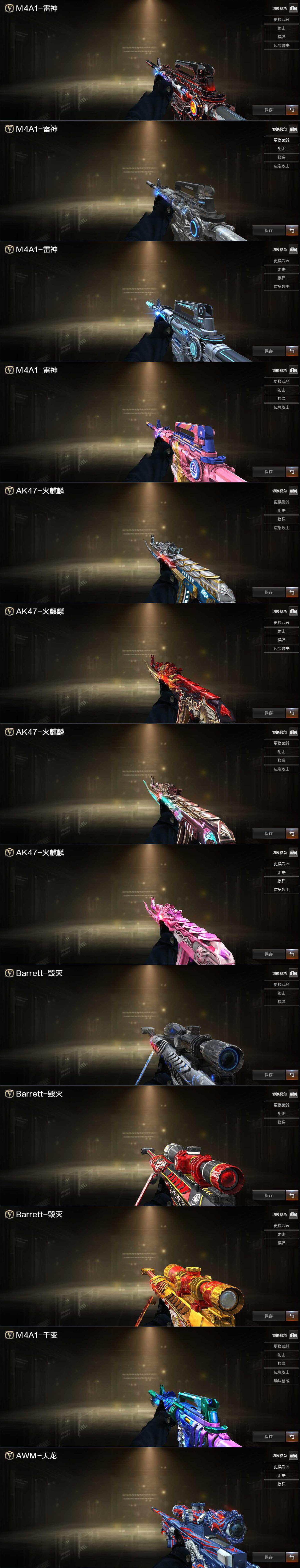 【英雄级武器】:M4A1-千变,AK47-火麒麟,M4A1-雷神*2,AK12-天启,AK47-黑鲨,HK417-朱雀,无影-神兵利器,M4A1-玫瑰精灵,QBZ03-金色蔷薇,王者之势-觉醒版,AWM-天龙,Barrett-毁灭,Barrett-金色蔷薇,王者之决-觉醒版,加特林-炼狱,沙鹰-修罗*2,修罗-云海游龙,屠龙,擎天-云海游龙,屠龙-云海游龙,手雷-云海游龙