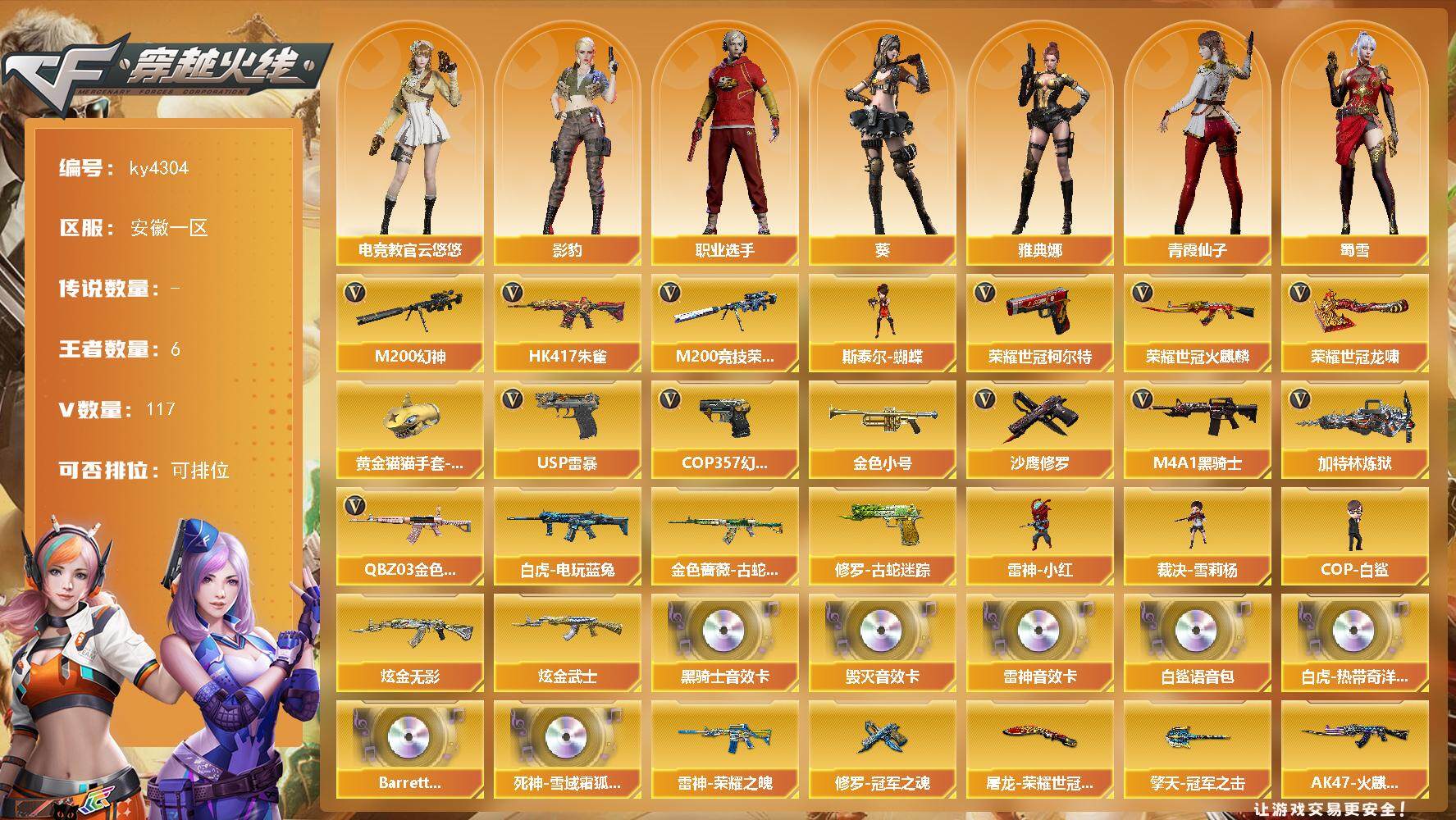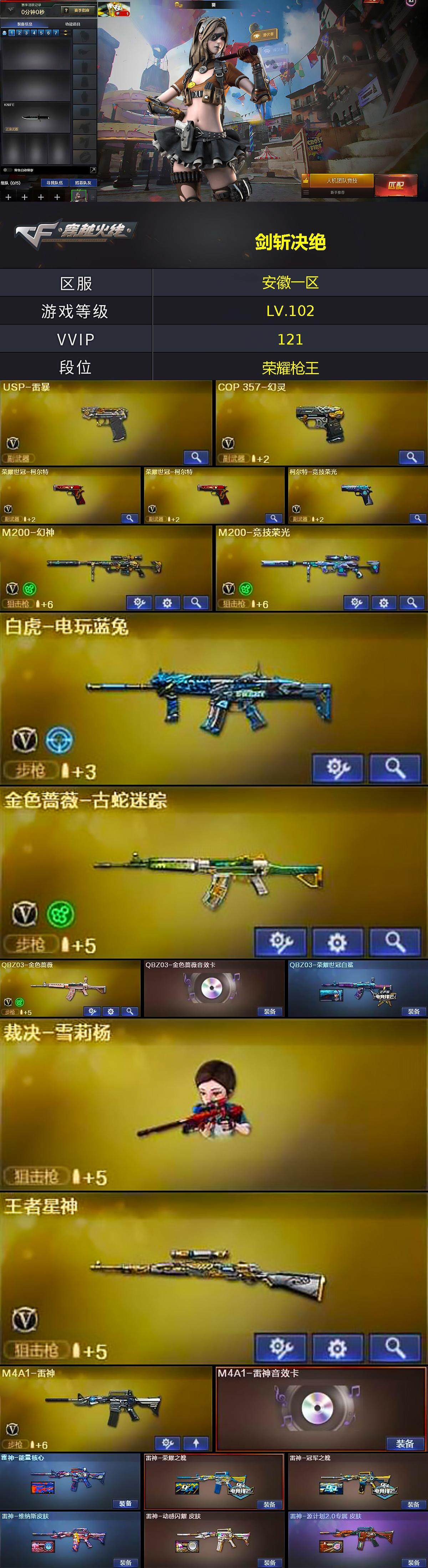 [15247305]安徽一区-117V-6王者-2炫金 【热门武器】:QBZ03-金色蔷薇,HK417-朱雀,M200-幻神,金色蔷薇-古蛇迷踪,修罗-古蛇迷踪,M200-竞技荣光,荣耀世冠-火麒麟,白虎-电玩蓝兔,荣耀世冠-柯尔特*2,金色小号,M4A1-黑骑士,加特林-炼狱*2,斯泰尔-蝴蝶,雷神-小红,裁决-雪莉杨,COP-白鲨,USP-雷暴,COP 357-幻灵,沙鹰-修罗*7,荣耀世冠-龙啸,黄金猫猫手套-白鲨 【王者炫金武器】:炫金无影,炫金武士 【音效卡】:Scar Light-白虎-热带奇洋音效卡,M4A1-雷神音效卡,M4A1-黑骑士音效卡,Barrett-毁灭音效卡,白鲨语音包,Barrett-碧霄极光音效卡*2,死神-雪域霜狐-怀旧音效卡 【皮肤】:QBZ03-荣耀世冠白鲨,雷神-能量核心,雷神-荣耀之魄,雷神-冠军之魄,雷神-维纳斯皮肤,雷神-动感闪耀 皮肤,雷神-源计划2.0专属 皮肤,火麒麟-雷神,火麒麟-冠军之心,AK47-火麒麟-传奇EVEN,火麒麟-百城,火麒麟-心动糖果,毁灭-冠军之怒,M4A1-千变-孔明皮肤,黑骑士-电玩青兔皮肤,黑骑士-破浪10年皮肤,死神-秘银,玫瑰精灵-蓝调梦幻 皮肤,战神-粉色甜心皮肤,战神-流金岁月皮肤,天龙-秘银*2,AWM-天龙-传奇白鲨,Barrett-金色蔷薇-蛇姬 皮肤,炼狱-月 皮肤,修罗-能量核心,修罗-冠军之魂,天神-暗月,屠龙-荣耀世冠AG,屠龙-春桃 皮肤,擎天-冠军之击,麒麟刺-荣耀世冠白鲨 【角色】:葵,影豹,电竞教官-云悠悠,雪域霜狐,蛇隐宗,奇洋探员,乔伊教练,云海玲珑,暗夜-X,初恋灵狐,电竞少女,芳心审判者,风暴女,虎妞,嘉年华灵狐,娟娟,灵狐-花神,灵狐者-七夕宝贝,麻雀,曼陀罗-X,潘多拉-X,潜龙队-X,青霞仙子,蛇姬,蜀雪,铁骑荣耀,兔囡囡,维纳斯,新娜塔莎,雪莉杨-摸金校尉,樱-战斗天使,影武者-X,游珑儿,职业选手,雅典娜 【人偶武器】:雷神-小红,COP-白鲨,裁决-雪莉杨,斯泰尔-蝴蝶,Scar Light-马枪,AWM-灵狐-15周年嘉年华,迷你深渊冰龙*2,迷你生化手雷,生化手雷-机甲核心*2,迷你艾比,迷你超能女侍 【暴走生化】:超级对讲机 【挑战大师】:冰龙粉碎者-白马银枪,机甲撕裂者III,神圣爆裂者-末日III 【英雄级武器】:AK47-火麒麟*2,M4A1-