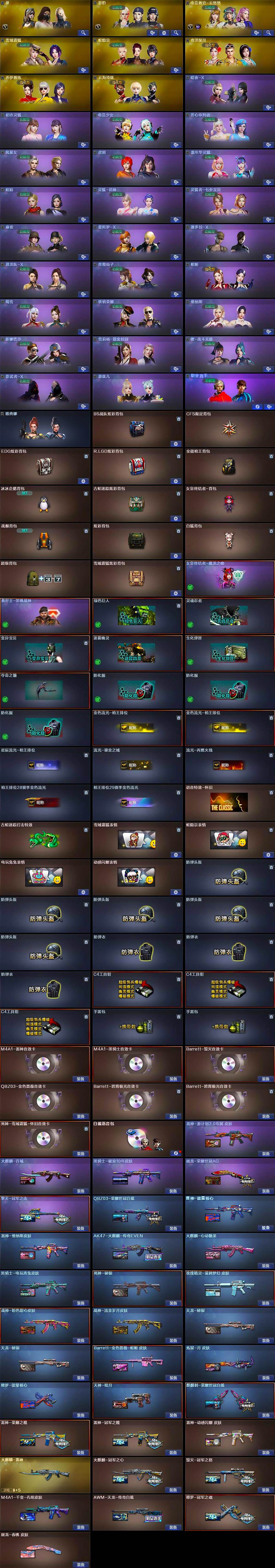 【皮肤】:QBZ03-荣耀世冠白鲨,雷神-能量核心,雷神-荣耀之魄,雷神-冠军之魄,雷神-维纳斯皮肤,雷神-动感闪耀 皮肤,雷神-源计划2.0专属 皮肤,火麒麟-雷神,火麒麟-冠军之心,AK47-火麒麟-传奇EVEN,火麒麟-百城,火麒麟-心动糖果,毁灭-冠军之怒,M4A1-千变-孔明皮肤,黑骑士-电玩青兔皮肤,黑骑士-破浪10年皮肤,死神-秘银,玫瑰精灵-蓝调梦幻 皮肤,战神-粉色甜心皮肤,战神-流金岁月皮肤,天龙-秘银*2,AWM-天龙-传奇白鲨,Barrett-金色蔷薇-蛇姬 皮肤,炼狱-月 皮肤,修罗-能量核心,修罗-冠军之魂,天神-暗月,屠龙-荣耀世冠AG,屠龙-春桃 皮肤,擎天-冠军之击,麒麟刺-荣耀世冠白鲨