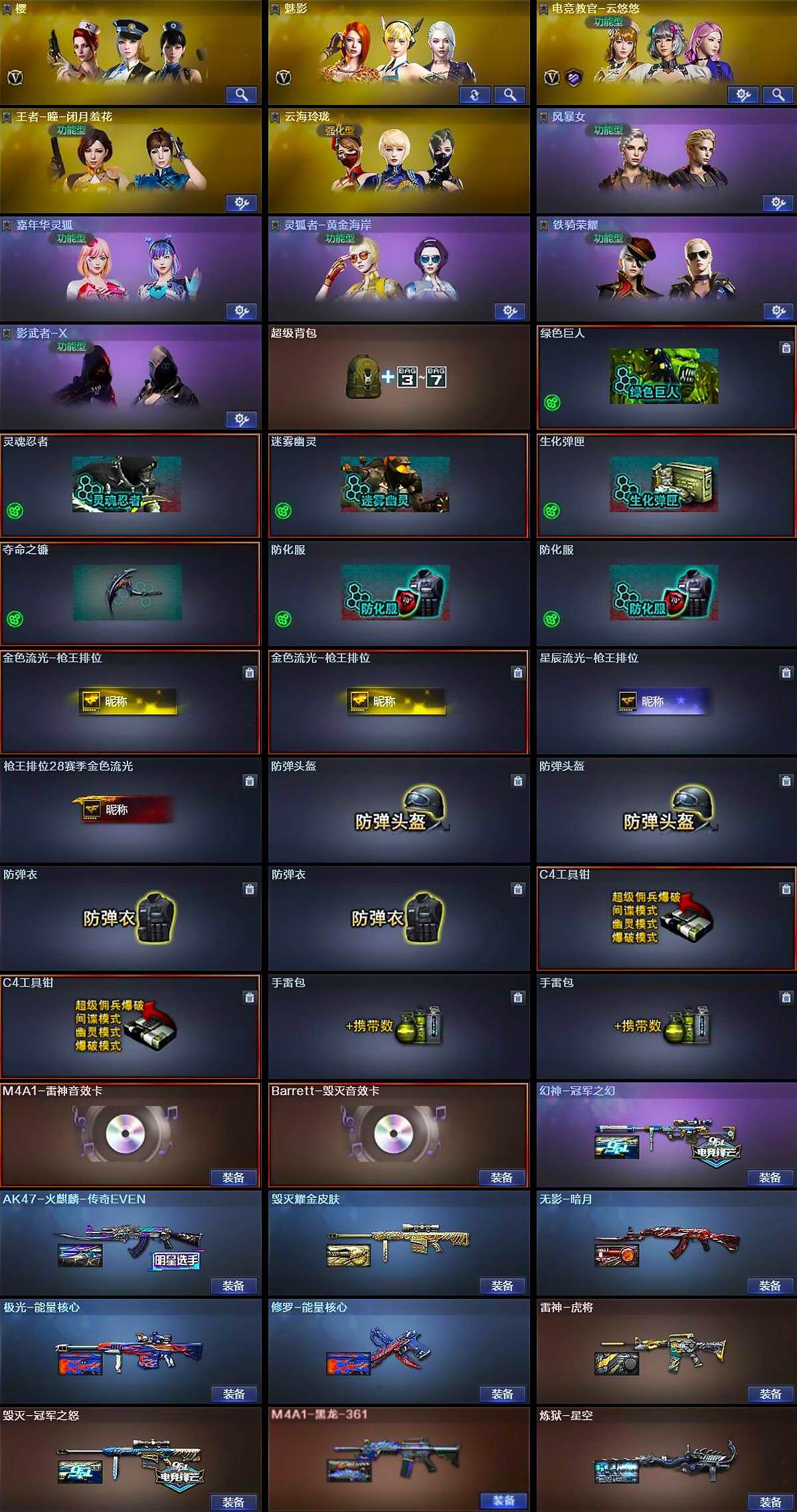 【英雄级武器】:AK47-火麒麟,M4A1-黑龙,M4A1-雷神*3,AK47-无影,QBZ03-金色蔷薇,王者之心-觉醒版,王者之武-觉醒版,AK-47-猩红传说,荣耀世冠-火麒麟,荣耀世冠-雷神,Barrett-毁灭,Barrett-极光,AWM-裁决,M200-竞技荣光*2,加特林-炼狱,AA-12-雷霆*2,沙鹰-修罗,USP-雷暴,荣耀世冠-柯尔特,柯尔特-竞技荣光,王者之灵-觉醒版*2,屠龙*3,麒麟刺-堕天神,擎天,擎天-竞技荣光*2,荣耀世冠-龙啸,龙啸-堕天神,高爆手雷-堕天神*3,高爆手雷-竞技荣光*7,闪光弹-堕天神*3,闪光弹-竞技荣光*7,烟雾弹-堕天神*3,烟雾弹-竞技荣光*7