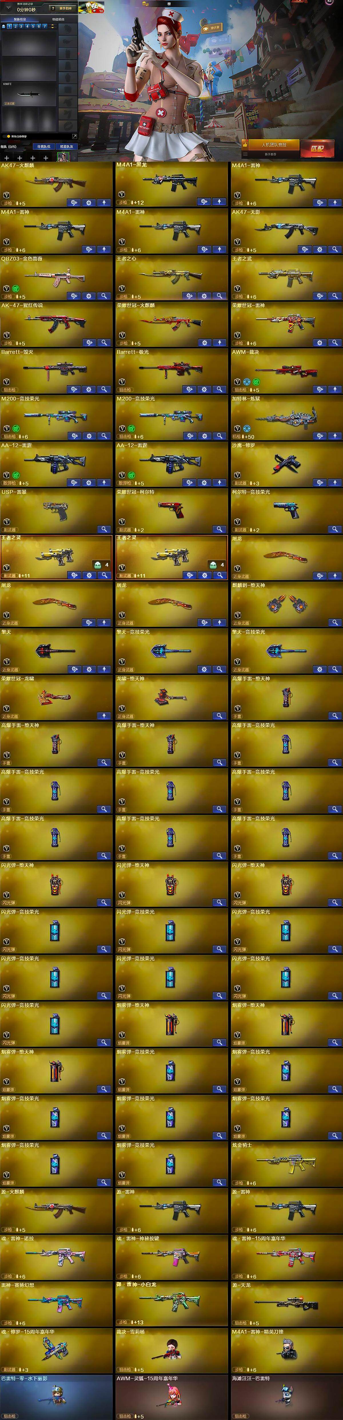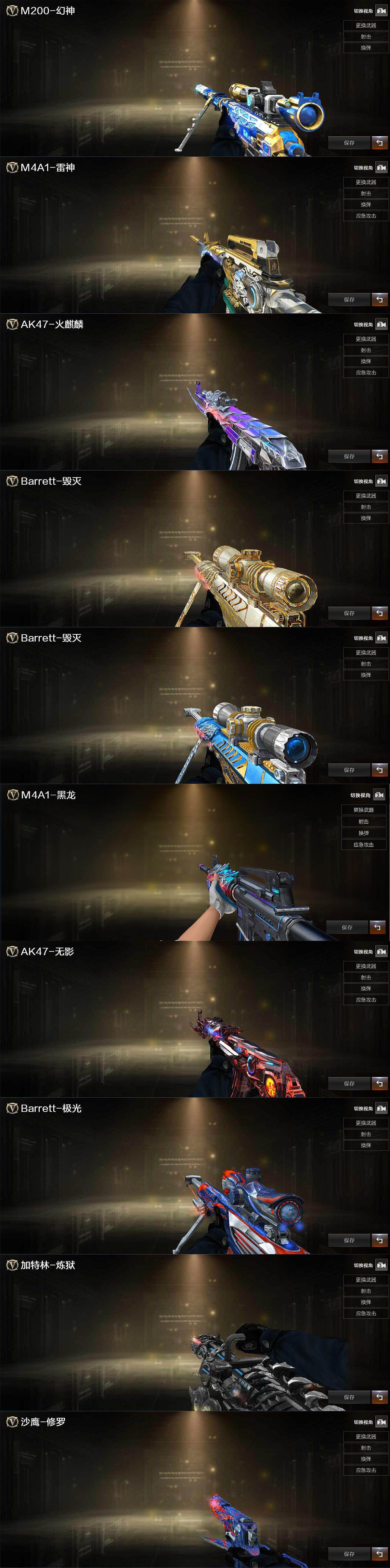 【皮肤】:幻神-冠军之幻,雷神-虎将,AK47-火麒麟-传奇EVEN,毁灭耀金皮肤,毁灭-冠军之怒,M4A1-黑龙-361,无影-暗月,极光-能量核心,炼狱-星空,修罗-能量核心