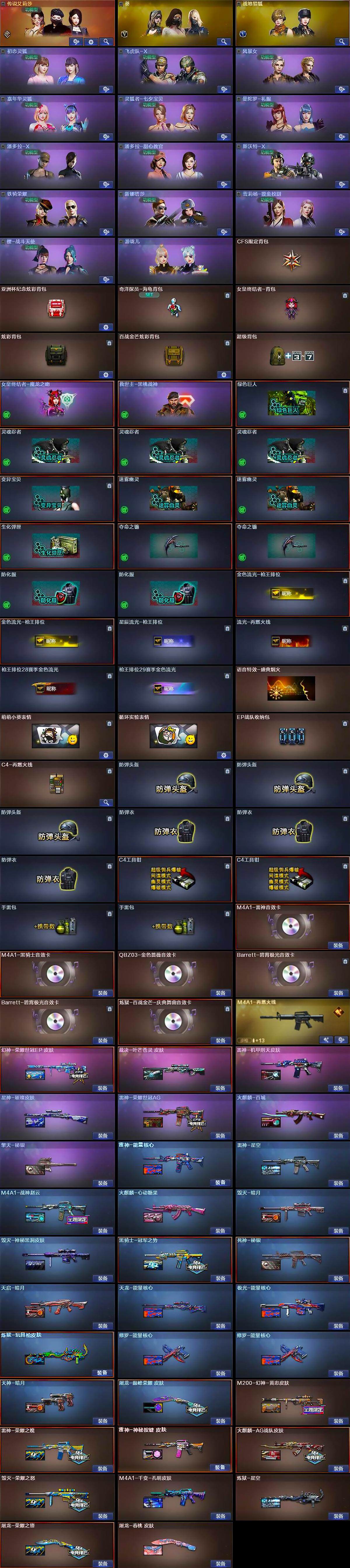 【皮肤】:M200-幻神-黄忠皮肤,幻神-荣耀世冠EP 皮肤,QBZ03-荣耀世冠EP 皮肤,金色蔷薇-电竞之星 皮肤,裁决-叶芒苍灵 皮肤,裁决-胜者为王 皮肤,星神-璀璨皮肤,雷神-能量核心,雷神-荣耀之魄,雷神-星空,M4A1-战神赵云,雷神-荣耀世冠AG,雷神-机甲刑天皮肤,M4A1-再燃火线,雷神-神秘按键 皮肤,火麒麟-AG战队皮肤,火麒麟-百城,火麒麟-心动糖果,毁灭-暗月,毁灭-荣耀之怒,毁灭-神秘黑洞皮肤,毁灭-英雄计划 皮肤,M4A1-千变-孔明皮肤,黑骑士-冠军之势,死神-秘银,天启-暗月,天龙-能量核心,极光-能量核心,炼狱-星空,炼狱-玩具枪皮肤,修罗-能量核心*2,天神-暗月,屠龙-荣耀之锋,屠龙-春桃 皮肤,屠龙-巅峰荣耀 皮肤,轻型军用手斧-再燃火线,龙啸-青青莓果 皮肤,擎天-秘银