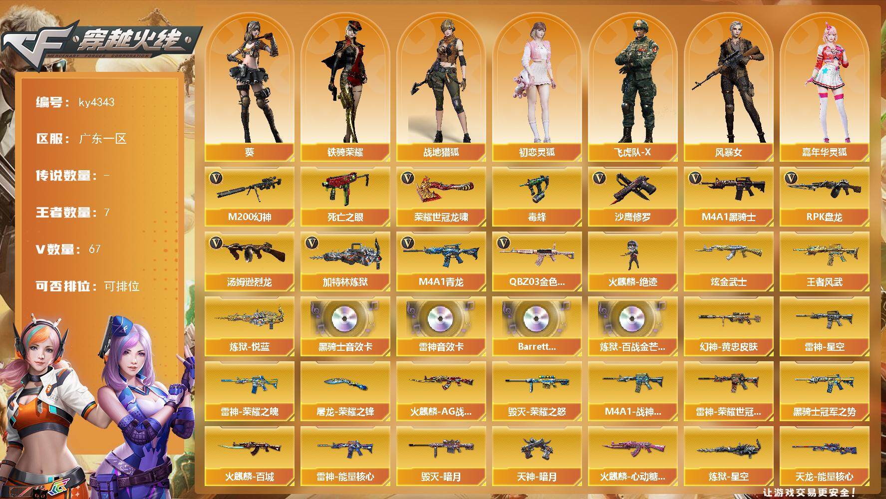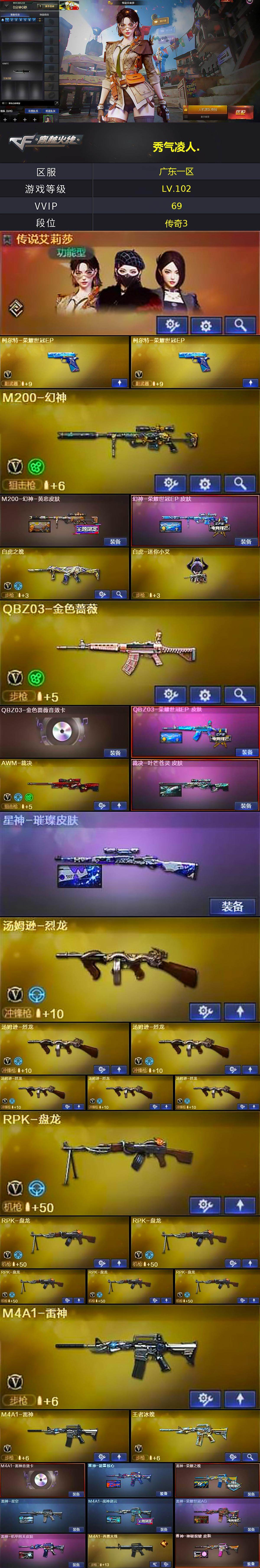 [15247550]广东一区-67V-7王者-1炫金 【传说角色】:传说艾莉莎 【热门武器】:QBZ03-金色蔷薇,M4A1-青龙,M200-幻神,死亡之眼,毒蜂,M4A1-黑骑士*2,汤姆逊-烈龙*6,RPK-盘龙*6,加特林-炼狱,火麒麟-绝迹,沙鹰-修罗*4,荣耀世冠-龙啸 【王者炫金武器】:王者风武,炼狱-悦蓝,炫金武士 【音效卡】:M4A1-雷神音效卡,M4A1-黑骑士音效卡,Barrett-碧霄极光音效卡*2,炼狱-百战金芒-庆典舞曲音效卡 【皮肤】:M200-幻神-黄忠皮肤,幻神-荣耀世冠EP 皮肤,QBZ03-荣耀世冠EP 皮肤,金色蔷薇-电竞之星 皮肤,裁决-叶芒苍灵 皮肤,裁决-胜者为王 皮肤,星神-璀璨皮肤,雷神-能量核心,雷神-荣耀之魄,雷神-星空,M4A1-战神赵云,雷神-荣耀世冠AG,雷神-机甲刑天皮肤,M4A1-再燃火线,雷神-神秘按键 皮肤,火麒麟-AG战队皮肤,火麒麟-百城,火麒麟-心动糖果,毁灭-暗月,毁灭-荣耀之怒,毁灭-神秘黑洞皮肤,毁灭-英雄计划 皮肤,M4A1-千变-孔明皮肤,黑骑士-冠军之势,死神-秘银,天启-暗月,天龙-能量核心,极光-能量核心,炼狱-星空,炼狱-玩具枪皮肤,修罗-能量核心*2,天神-暗月,屠龙-荣耀之锋,屠龙-春桃 皮肤,屠龙-巅峰荣耀 皮肤,轻型军用手斧-再燃火线,龙啸-青青莓果 皮肤,擎天-秘银 【角色】:葵,战地猎狐,初恋灵狐,飞虎队-X,风暴女,嘉年华灵狐,灵狐者-七夕宝贝,曼陀罗-礼服,潘多拉-X,潘多拉-甜心教官,邱刚敖,斯沃特-X,铁骑荣耀,兔囡囡,新娜塔莎,雪莉杨-摸金校尉,樱-战斗天使,游珑儿 【人偶武器】:火麒麟-绝迹,白虎-迷你小艾,AWM-灵狐-15周年嘉年华,COP-旗袍,迷你深渊冰龙 【暴走生化】:毒蜂,死亡之眼,超级对讲机 【挑战大师】:冰龙粉碎者-白马银枪,激光毁灭者III-白马银枪,神圣爆裂者-末日III*2 【英雄级武器】:AK47-火麒麟*2,M4A1-黑龙,M4A1-雷神*2,M4A1-黑骑士*2,AK47-黑武士,AN94-超新星,M4A1-青龙,无影-神兵利器,QBZ03-独角-V,QBZ03-金色蔷薇,王者之心-觉醒版,王者冰魄-觉醒版,黑骑士-海王,白虎之魄-觉醒版,AWM-天龙*2,Barrett-毁灭*2,Barrett-极光,AWM-裁决,M200-幻神,王者之光-