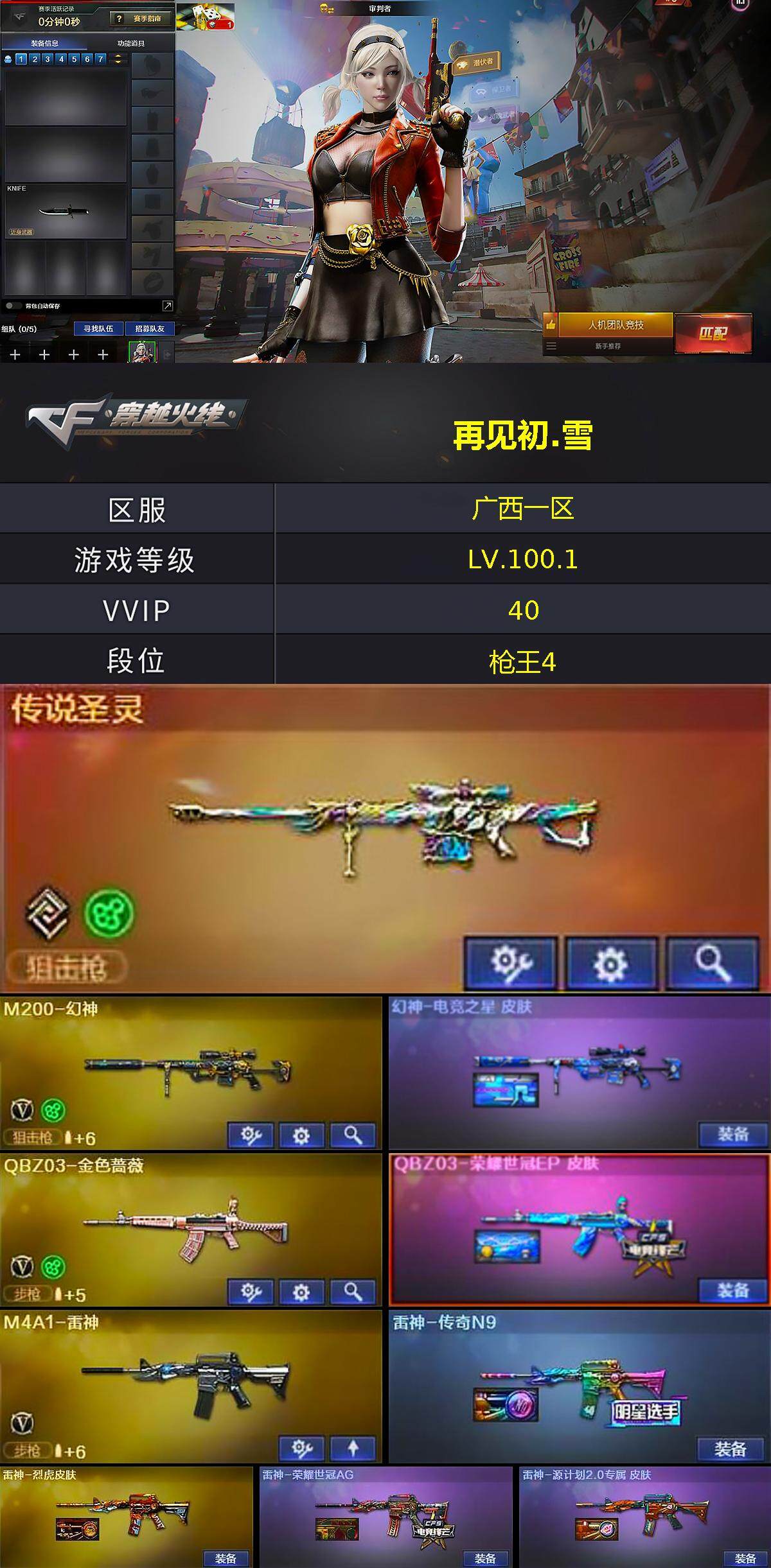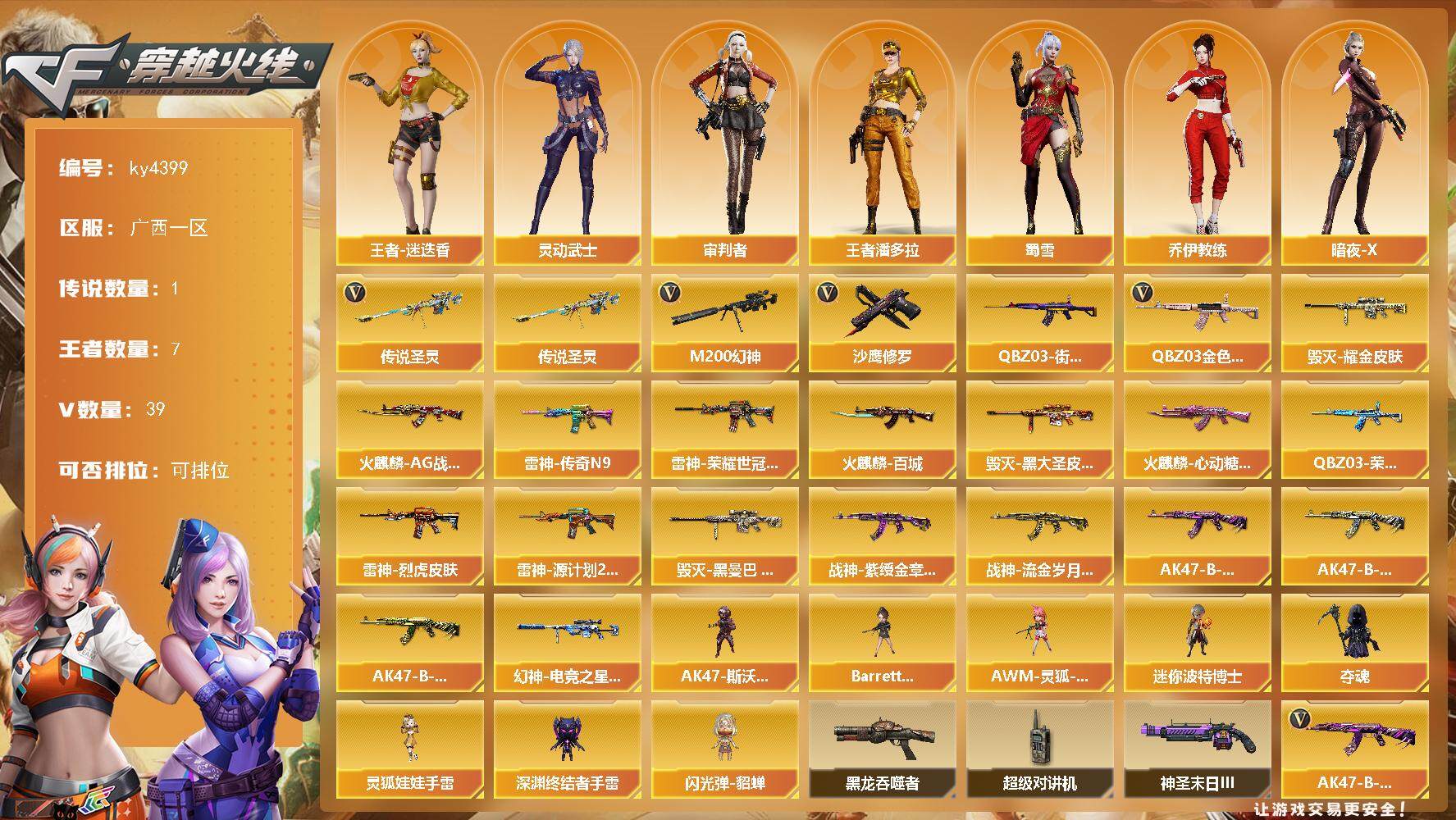[15247833]广西一区-39V-7王者-0炫金 【传说武器】:传说圣灵 【热门武器】:传说圣灵,QBZ03-金色蔷薇,M200-幻神,QBZ03-街机,沙鹰-修罗*5 【皮肤】:幻神-电竞之星 皮肤,QBZ03-荣耀世冠EP 皮肤,雷神-传奇N9,雷神-烈虎皮肤,雷神-荣耀世冠AG,雷神-源计划2.0专属 皮肤,火麒麟-AG战队皮肤,火麒麟-百城,火麒麟-心动糖果,毁灭耀金皮肤,毁灭-黑大圣皮肤,毁灭-黑曼巴 皮肤,战神-紫绶金章皮肤,战神-流金岁月皮肤,AK47-B-常胜将军-曹操,AK47-B-常胜将军-刘备,AK47-B-常胜将军-孙权 【角色】:审判者,妮妮,王者-迷迭香,王者潘多拉,乔伊教练,暗夜-X,飞虎队-X,风暴女,虎妞,嘉年华灵狐,兰妹妹,猎狐者-追月,0号玩家,灵动武士,灵狐者-X,灵狐者-黄金海岸,灵狐者-七夕宝贝,流浪蔷薇,龙儿-小淘气,萌儿,潘多拉-X,潘多拉-甜心教官,斯沃特-X,蜀雪,兔囡囡,雪莉杨,夜玫瑰-幻能朋克,游珑儿 【人偶武器】:AWM-灵狐-15周年嘉年华,迷你波特博士,夺魂,深渊终结者手雷,闪光弹-貂蝉,AK47-斯沃特,Barrett-夜玫瑰,灵狐娃娃手雷 【暴走生化】:黑龙吞噬者,超级对讲机 【挑战大师】:神圣爆裂者-末日III 【英雄级武器】:AK47-火麒麟*2,M4A1-雷神,M4A1-龙血,无影-神兵利器,黑武士-锦绣游龙,QBZ03-金色蔷薇,AK-47-猩红传说,AK47-B-常胜将军,AWM-天龙,Barrett-毁灭,M200-幻神,Barrett-金色蔷薇,沙鹰-修罗*5,屠龙,龙啸,麒麟刺*2,幻灵之锋,王者之击-觉醒版*2,高爆手雷-竞技荣光,手雷-动感闪耀,闪光弹-幻灵,闪光弹-竞技荣光,闪光弹-雷霆王者-觉醒版,烟雾弹-幻灵*3,烟雾弹-竞技荣光,M4A1-赤狱骑士 【道具】:CFS限定背包,亚洲杯纪念炫彩背包,超级背包,绿色巨人,灵魂忍者,变异宝贝,迷雾幽灵,夺命之镰,防化服*2,金色流光-枪王排位,枪王排位28赛季金色流光,语音特效-机器人,EP战队击杀图标*2,C4-红龙,防弹头盔*4,防弹衣*4,C4工具钳*4,手雷包*4 【特殊枪械】: