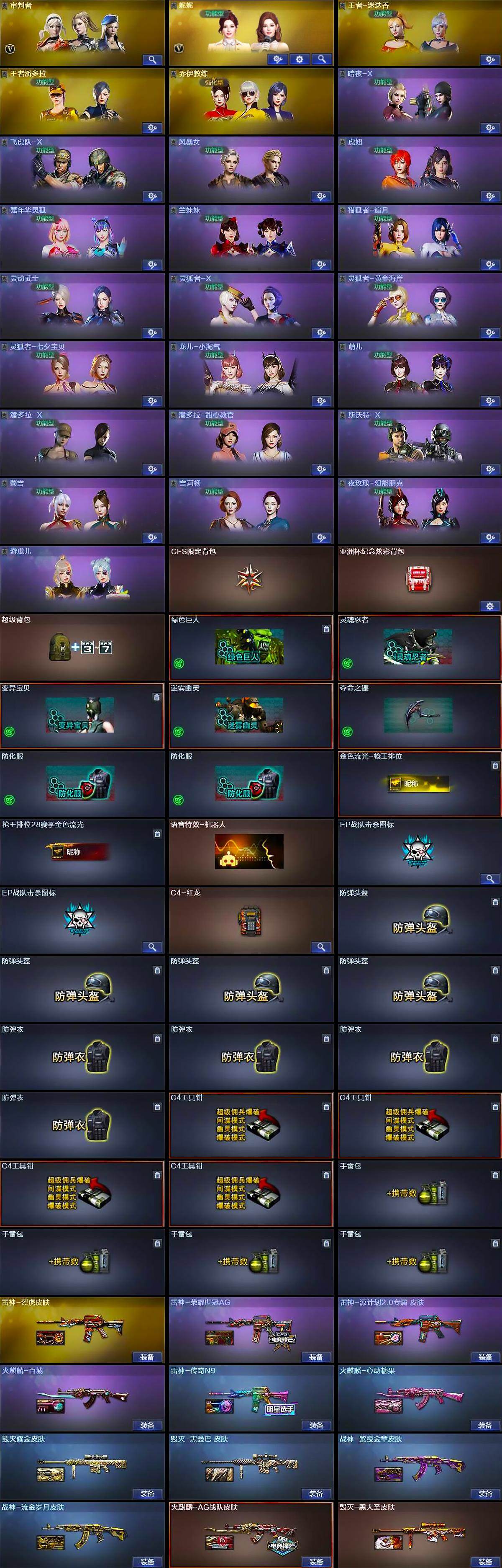 【道具】:CFS限定背包,亚洲杯纪念炫彩背包,超级背包,绿色巨人,灵魂忍者,变异宝贝,迷雾幽灵,夺命之镰,防化服*2,金色流光-枪王排位,枪王排位28赛季金色流光,语音特效-机器人,EP战队击杀图标*2,C4-红龙,防弹头盔*4,防弹衣*4,C4工具钳*4,手雷包*4