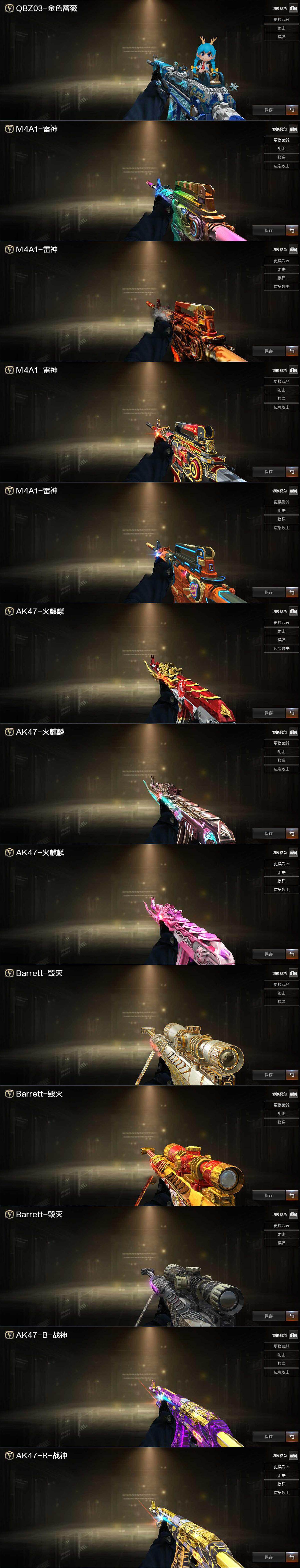 【皮肤】:幻神-电竞之星 皮肤,QBZ03-荣耀世冠EP 皮肤,雷神-传奇N9,雷神-烈虎皮肤,雷神-荣耀世冠AG,雷神-源计划2.0专属 皮肤,火麒麟-AG战队皮肤,火麒麟-百城,火麒麟-心动糖果,毁灭耀金皮肤,毁灭-黑大圣皮肤,毁灭-黑曼巴 皮肤,战神-紫绶金章皮肤,战神-流金岁月皮肤,AK47-B-常胜将军-曹操,AK47-B-常胜将军-刘备,AK47-B-常胜将军-孙权