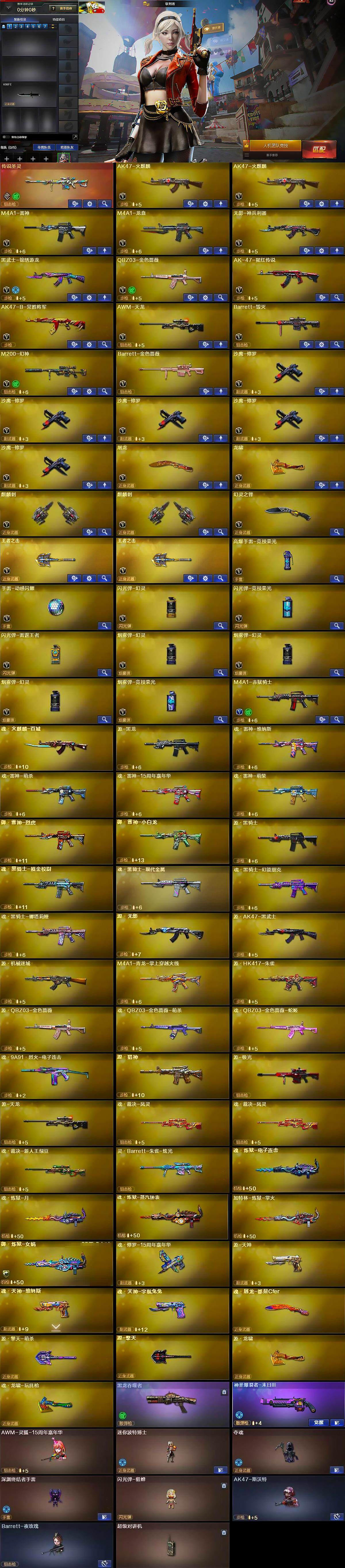 【英雄级武器】:AK47-火麒麟*2,M4A1-雷神,M4A1-龙血,无影-神兵利器,黑武士-锦绣游龙,QBZ03-金色蔷薇,AK-47-猩红传说,AK47-B-常胜将军,AWM-天龙,Barrett-毁灭,M200-幻神,Barrett-金色蔷薇,沙鹰-修罗*5,屠龙,龙啸,麒麟刺*2,幻灵之锋,王者之击-觉醒版*2,高爆手雷-竞技荣光,手雷-动感闪耀,闪光弹-幻灵,闪光弹-竞技荣光,闪光弹-雷霆王者-觉醒版,烟雾弹-幻灵*3,烟雾弹-竞技荣光,M4A1-赤狱骑士