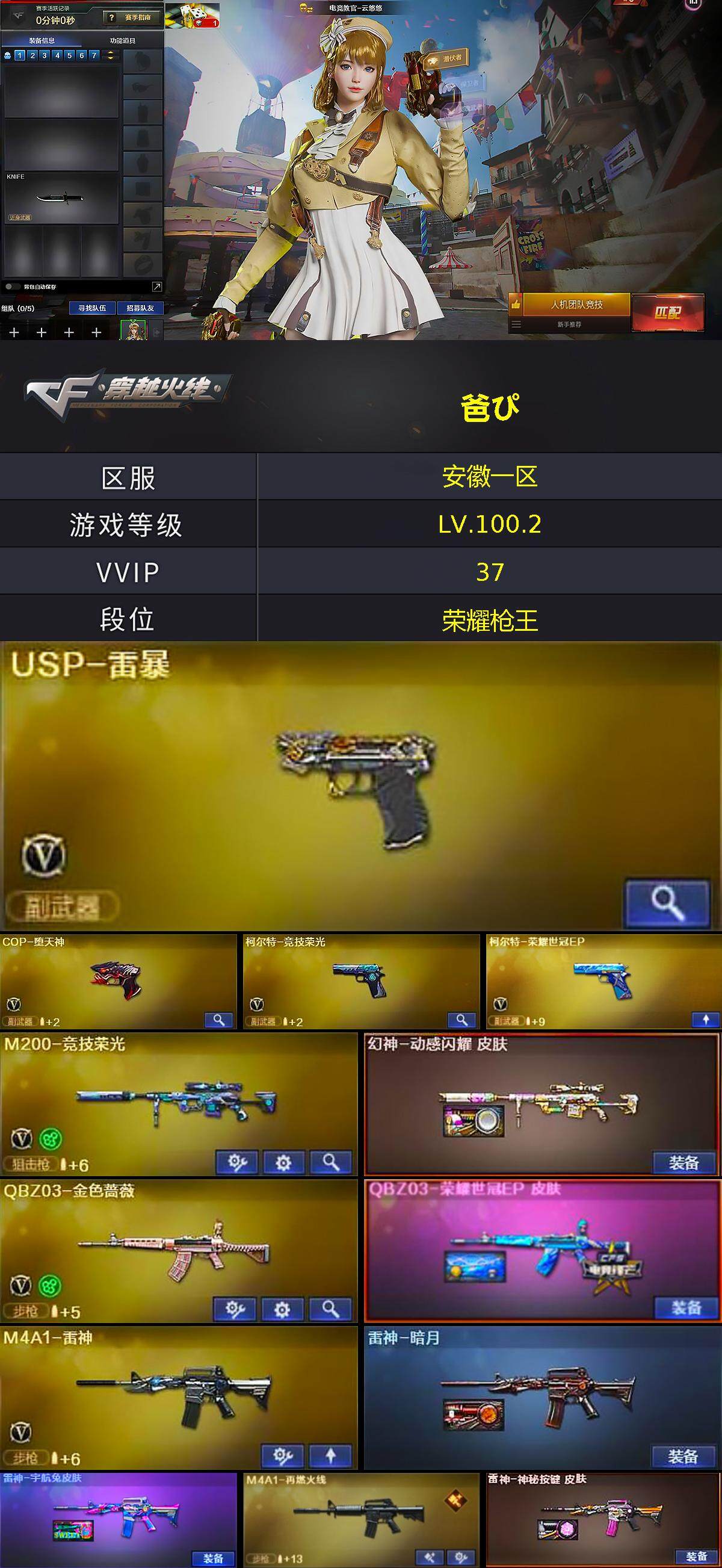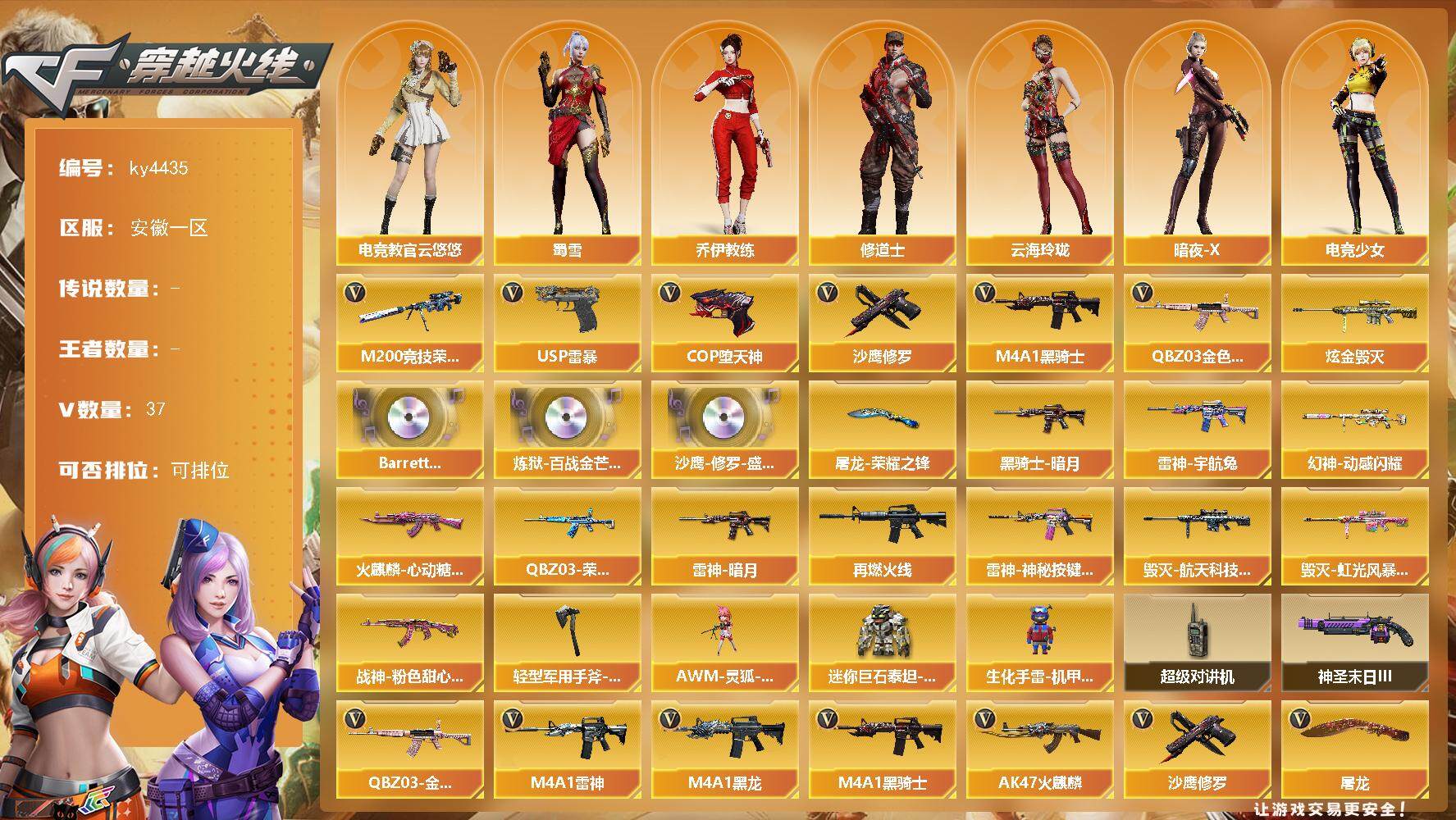 [15248056]安徽一区-37V-0王者-1炫金 【热门武器】:QBZ03-金色蔷薇,M200-竞技荣光,M4A1-黑骑士,USP-雷暴,COP-堕天神,沙鹰-修罗 【王者炫金武器】:炫金毁灭 【音效卡】:Barrett-碧霄极光音效卡,炼狱-百战金芒-庆典舞曲音效卡,沙鹰-修罗-盛典舞曲音效卡 【皮肤】:幻神-动感闪耀 皮肤,QBZ03-荣耀世冠EP 皮肤,雷神-暗月,雷神-宇航兔皮肤,M4A1-再燃火线,雷神-神秘按键 皮肤,火麒麟-心动糖果,毁灭-航天科技皮肤,毁灭-虹光风暴 皮肤,黑骑士-暗月,战神-粉色甜心皮肤,屠龙-荣耀之锋,轻型军用手斧-再燃火线 【角色】:电竞教官-云悠悠,妮妮,乔伊教练,修道士,云海玲珑,暗夜-X,电竞少女,芳心审判者,嘉年华灵狐,娟娟,兰-海滩派对,兰妹妹,麻雀,潘多拉-X,潘多拉-甜心教官,斯沃特-X,蜀雪,兔囡囡 【人偶武器】:AWM-灵狐-15周年嘉年华*2,生化手雷-机甲核心,迷你巨石泰坦-魔花研究所 【暴走生化】:超级对讲机 【挑战大师】:神圣爆裂者-末日III 【英雄级武器】:AK47-火麒麟*2,M4A1-黑龙,M4A1-雷神,M4A1-黑骑士,无影-神兵利器,QBZ03-金色蔷薇,M200-竞技荣光,炼狱-百战金芒,沙鹰-修罗,USP-雷暴,COP-堕天神,柯尔特-竞技荣光,柯尔特-荣耀世冠EP,屠龙,麒麟刺-百战金芒,高爆手雷-竞技荣光*3,闪光弹-竞技荣光*3,烟雾弹-竞技荣光*3,烟雾弹-荣耀世冠EP,M4A1-苍鸣雷神,Barrett-碧霄极光*2 【道具】:BS战队炫彩背包,CFS限定背包,EP战队炫彩背包,云山科技背包,全能枪王背包,奇洋探员-海龟背包,女皇终结者-背包,炫彩背包-诺拉,百战金芒炫彩背包,雪域霜狐炫彩背包,女皇终结者-魔龙之吻,救世主-黑桃战神,绿色巨人,灵魂忍者*2,迷雾幽灵,生化弹匣,夺命之镰,防化服*3,金色流光-枪王排位*2,星辰流光-枪王排位,枪王排位28赛季金色流光,语音特效-盛典烟火,雪域霜狐表情,萌萌小葵表情,防弹头盔*5,防弹衣*4,C4工具钳*5,手雷包*5 【特殊枪械】:1黑骑士