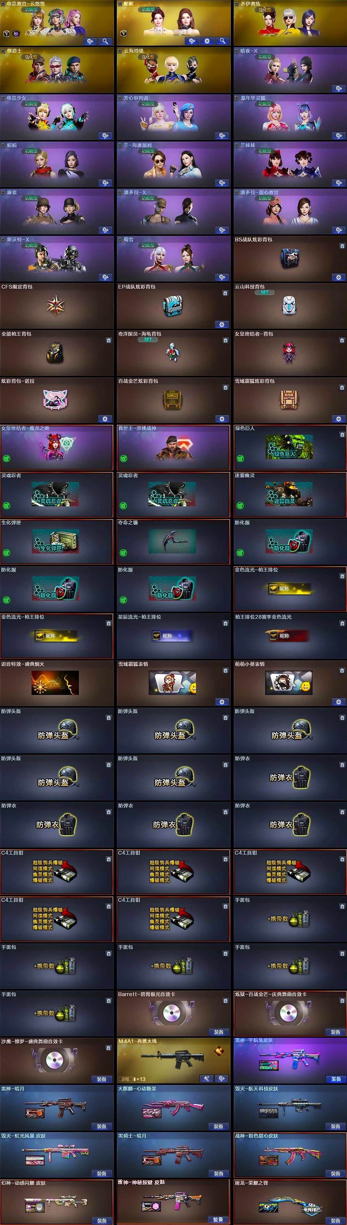 【道具】:BS战队炫彩背包,CFS限定背包,EP战队炫彩背包,云山科技背包,全能枪王背包,奇洋探员-海龟背包,女皇终结者-背包,炫彩背包-诺拉,百战金芒炫彩背包,雪域霜狐炫彩背包,女皇终结者-魔龙之吻,救世主-黑桃战神,绿色巨人,灵魂忍者*2,迷雾幽灵,生化弹匣,夺命之镰,防化服*3,金色流光-枪王排位*2,星辰流光-枪王排位,枪王排位28赛季金色流光,语音特效-盛典烟火,雪域霜狐表情,萌萌小葵表情,防弹头盔*5,防弹衣*4,C4工具钳*5,手雷包*5