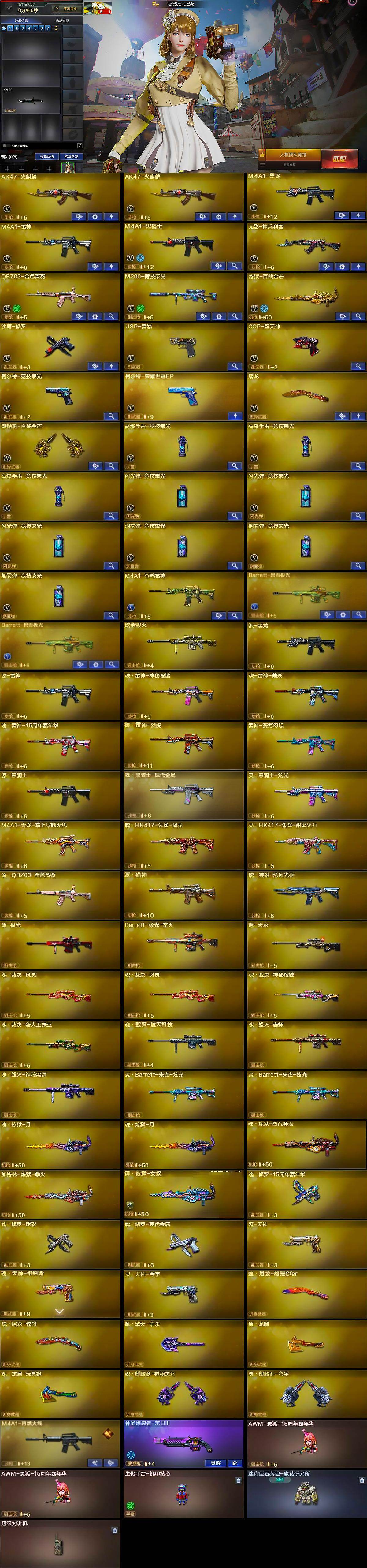 【英雄级武器】:AK47-火麒麟*2,M4A1-黑龙,M4A1-雷神,M4A1-黑骑士,无影-神兵利器,QBZ03-金色蔷薇,M200-竞技荣光,炼狱-百战金芒,沙鹰-修罗,USP-雷暴,COP-堕天神,柯尔特-竞技荣光,柯尔特-荣耀世冠EP,屠龙,麒麟刺-百战金芒,高爆手雷-竞技荣光*3,闪光弹-竞技荣光*3,烟雾弹-竞技荣光*3,烟雾弹-荣耀世冠EP,M4A1-苍鸣雷神,Barrett-碧霄极光*2