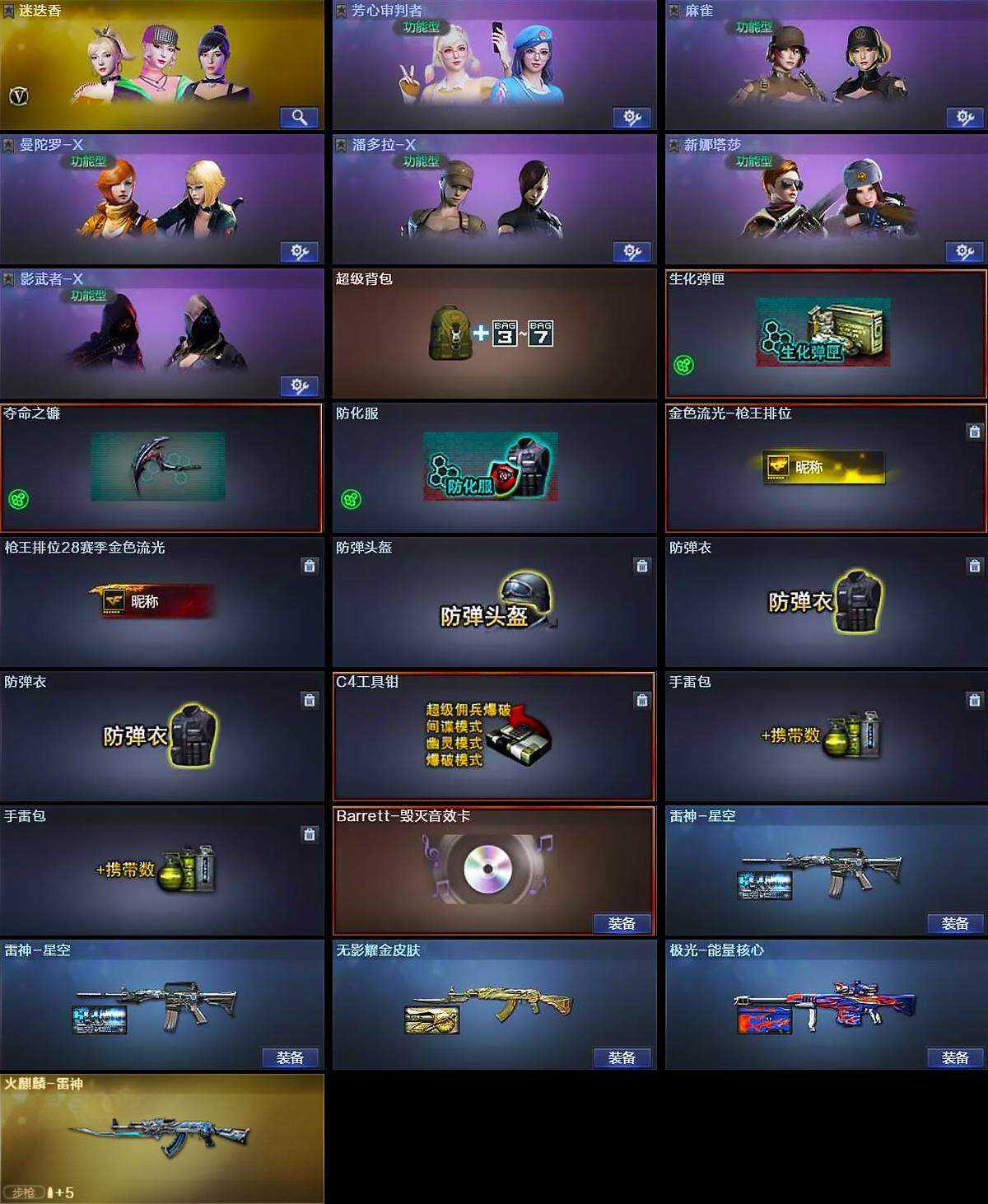 【道具】:超级背包,生化弹匣,夺命之镰,防化服,金色流光-枪王排位,枪王排位28赛季金色流光,防弹头盔,防弹衣*2,C4工具钳,手雷包*2