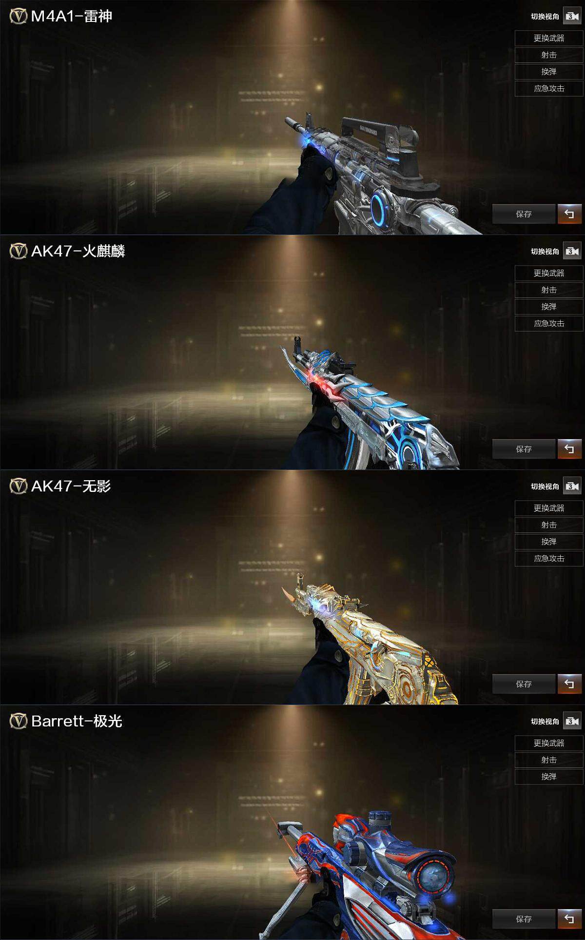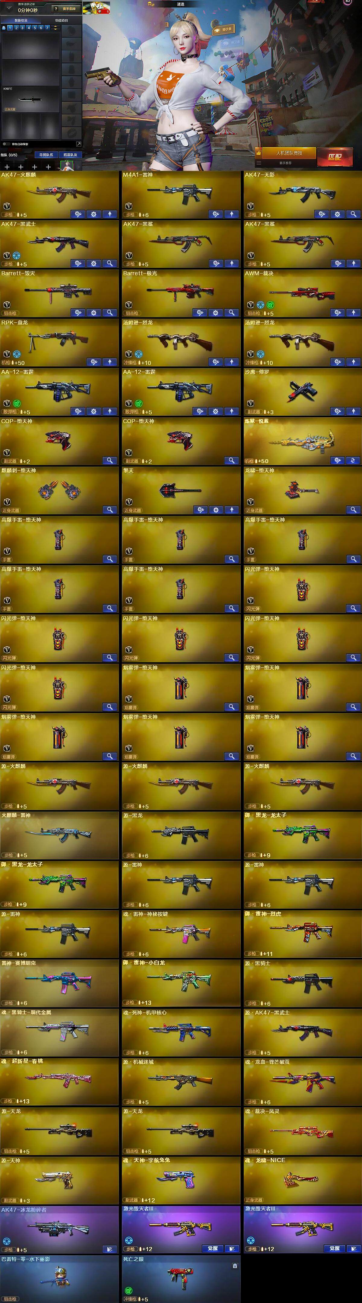【英雄级武器】:AK47-火麒麟,M4A1-雷神,AK47-无影,AK47-黑武士,AK47-黑鲨*2,Barrett-毁灭,Barrett-极光,AWM-裁决,RPK-盘龙,汤姆逊-烈龙*2,AA-12-雷霆*2,沙鹰-修罗,COP-堕天神*2,麒麟刺-堕天神,擎天,龙啸-堕天神,高爆手雷-堕天神*5,闪光弹-堕天神*5,烟雾弹-堕天神*5