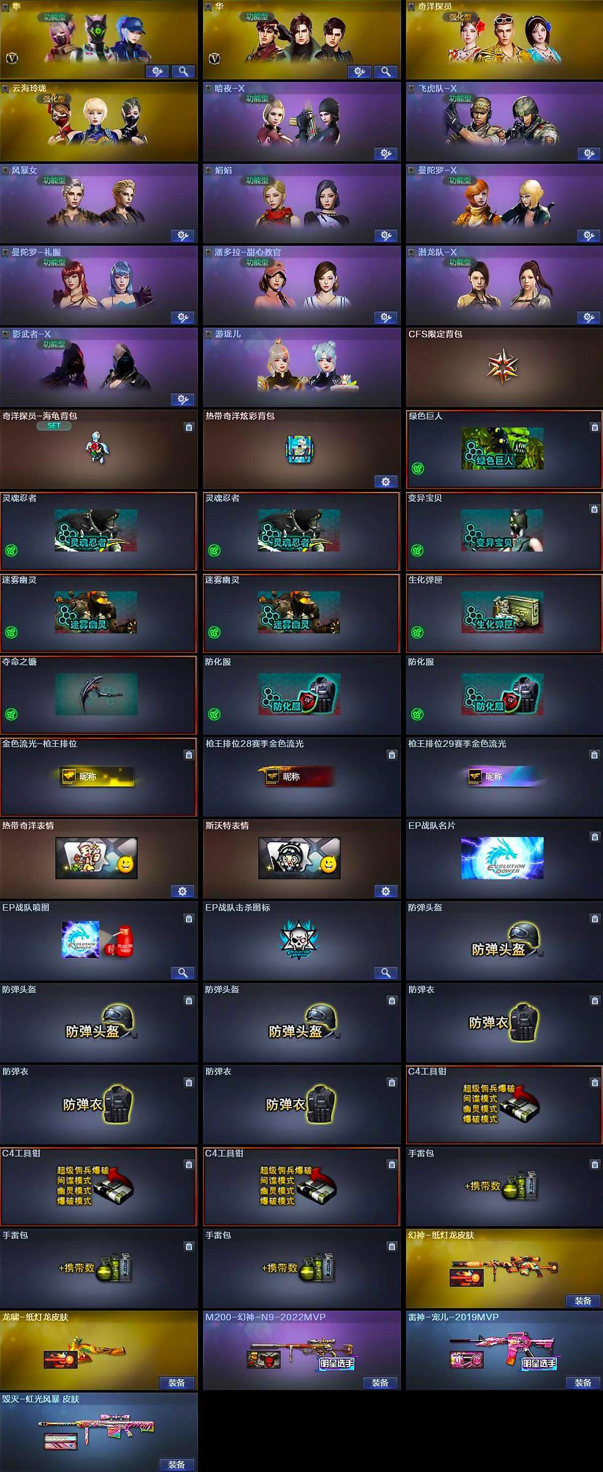 【道具】:CFS限定背包,奇洋探员-海龟背包,热带奇洋炫彩背包,绿色巨人,灵魂忍者*2,变异宝贝,迷雾幽灵*2,生化弹匣,夺命之镰,防化服*2,金色流光-枪王排位,枪王排位28赛季金色流光,枪王排位29赛季金色流光,热带奇洋表情,斯沃特表情,EP战队名片,EP战队喷图,EP战队击杀图标,防弹头盔*3,防弹衣*3,C4工具钳*3,手雷包*3