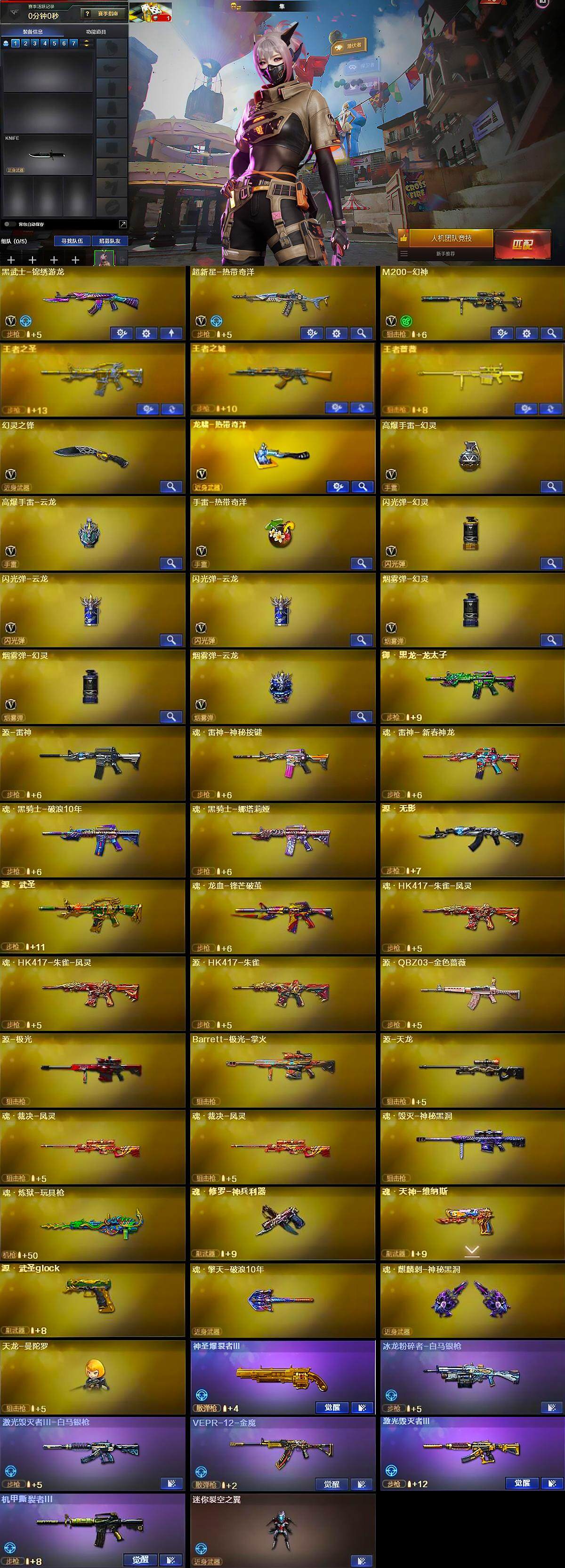 【英雄级武器】:黑武士-锦绣游龙,超新星-热带奇洋,M200-幻神,幻灵之锋,龙啸-热带奇洋,高爆手雷-幻灵,高爆手雷-云龙,手雷-热带奇洋,闪光弹-幻灵,闪光弹-云龙*2,烟雾弹-幻灵*2,烟雾弹-云龙,烟雾弹-荣耀世冠EP