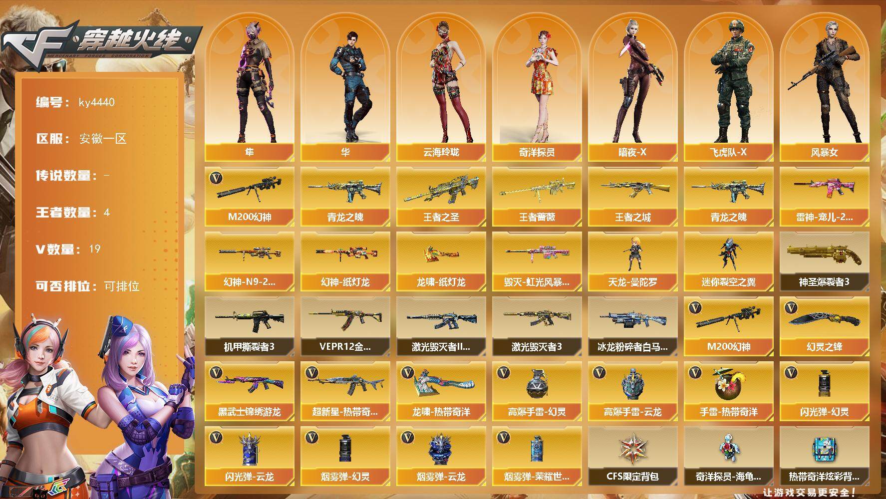 [15248095]安徽一区-19V-4王者-0炫金 【热门武器】:M200-幻神,青龙之魄 【王者炫金武器】:王者之圣,王者之城,青龙之魄,王者蔷薇 【皮肤】:M200-幻神-N9-2022MVP,幻神-纸灯龙皮肤,雷神-宠儿-2019MVP,毁灭-虹光风暴 皮肤,龙啸-纸灯龙皮肤 【角色】:隼,华,奇洋探员,云海玲珑,暗夜-X,飞虎队-X,风暴女,娟娟,曼陀罗-X,曼陀罗-礼服,潘多拉-甜心教官,潜龙队-X,兔囡囡,影武者-X,游珑儿 【人偶武器】:天龙-曼陀罗,迷你裂空之翼 【挑战大师】:神圣爆裂者III,冰龙粉碎者-白马银枪,激光毁灭者III-白马银枪,VEPR-12-金魔,激光毁灭者III,机甲撕裂者III 【英雄级武器】:黑武士-锦绣游龙,超新星-热带奇洋,M200-幻神,幻灵之锋,龙啸-热带奇洋,高爆手雷-幻灵,高爆手雷-云龙,手雷-热带奇洋,闪光弹-幻灵,闪光弹-云龙*2,烟雾弹-幻灵*2,烟雾弹-云龙,烟雾弹-荣耀世冠EP 【道具】:CFS限定背包,奇洋探员-海龟背包,热带奇洋炫彩背包,绿色巨人,灵魂忍者*2,变异宝贝,迷雾幽灵*2,生化弹匣,夺命之镰,防化服*2,金色流光-枪王排位,枪王排位28赛季金色流光,枪王排位29赛季金色流光,热带奇洋表情,斯沃特表情,EP战队名片,EP战队喷图,EP战队击杀图标,防弹头盔*3,防弹衣*3,C4工具钳*3,手雷包*3 【特殊枪械】: