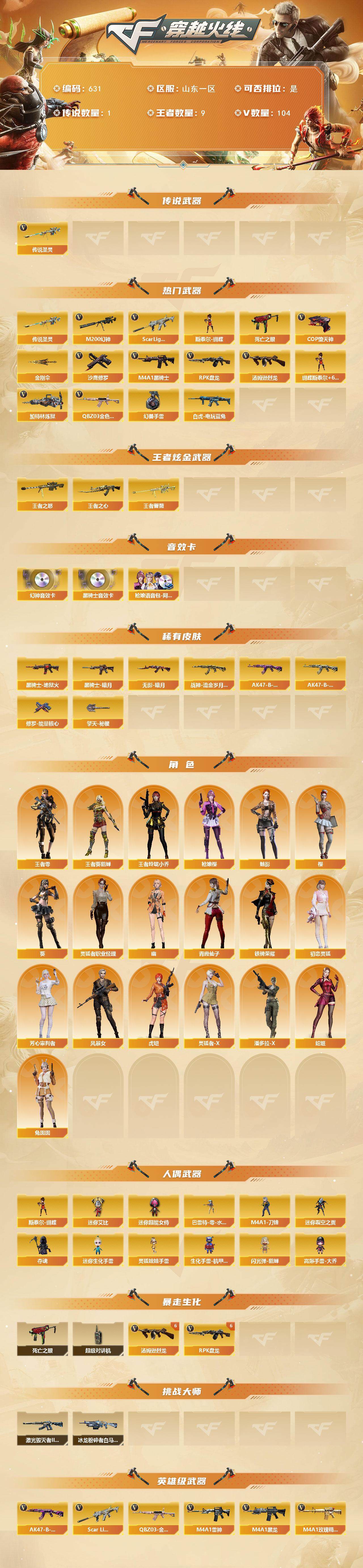 [15248137]山东一区-104V-9王者-0炫金 【传说武器】:传说圣灵 【热门武器】:传说圣灵,QBZ03-金色蔷薇,Scar Light-白虎,M200-幻神,死亡之眼,白虎-电玩蓝兔,M4A1-黑骑士,汤姆逊-烈龙*6,RPK-盘龙*6,加特林-炼狱,斯泰尔-蝴蝶,COP-堕天神*2,沙鹰-修罗*5,金刚伞,高爆手雷-幻兽 【王者炫金武器】:王者之心,王者之怒,王者蔷薇 【音效卡】:M200-幻神音效卡,M4A1-黑骑士音效卡,枪娘语音包-阿敏 【皮肤】:黑骑士-暗月,黑骑士-地狱火,无影-暗月,战神-流金岁月皮肤,AK47-B-常胜将军-曹操,AK47-B-常胜将军-刘备*3,修罗-能量核心,擎天-秘银 【角色】:葵,樱,魅影,枪娘樱,王者-葵-貂蝉,王者-零,王者玲珑-小乔,初恋灵狐,芳心审判者,风暴女,虎妞,灵狐者-X,灵狐者-职业经理,潘多拉-X,青霞仙子,蛇姬,铁骑荣耀,兔囡囡,幽 【人偶武器】:斯泰尔-蝴蝶,巴雷特-零-水下丽影,M4A1-刀锋,迷你裂空之翼*2,夺魂,迷你生化手雷,生化手雷-机甲核心*2,闪光弹-貂蝉,高爆手雷-大乔,迷你艾比,迷你超能女侍,灵狐娃娃手雷 【暴走生化】:死亡之眼,超级对讲机 【挑战大师】:冰龙粉碎者-白马银枪,激光毁灭者III-白马银枪 【英雄级武器】:M4A1-千变,AK47-火麒麟*2,M4A1-黑龙,M4A1-雷神*2,M4A1-黑骑士,AK47-无影,M4A1-死神,AK47-黑武士,AK12-天启,AN94-超新星,M4A1-武圣,AK47-机械迷城,AK47-黑鲨,M4A1-龙血,M4A1-堕天神,Scar Light-白虎,M4A1-玫瑰精灵,QBZ03-金色蔷薇,M4A1-猎神,王者之翼-觉醒版,王者之魄-觉醒版,AK-47-猩红传说*2,AK47-B-战神,AK47-B-常胜将军*2,白虎-电玩蓝兔,AWM-天龙,Barrett-毁灭,Barrett-极光,M200-幻神,Barrett-朱雀,RPK-盘龙*6,加特林-炼狱,汤姆逊-烈龙*6,沙鹰-修罗*5,沙鹰-天神*6,COP-堕天神*2,沙鹰-幻兽,Glock18-武圣,屠龙*5,龙啸,麒麟刺-堕天神*2,擎天,麒麟刺,幻灵之锋,龙啸-堕天神,女皇利刃-幻兽,王者之锋-觉醒版,王者之啸-觉醒版,王者之击-觉醒版*2,高爆手雷-幻兽,高爆手雷-堕天神*5