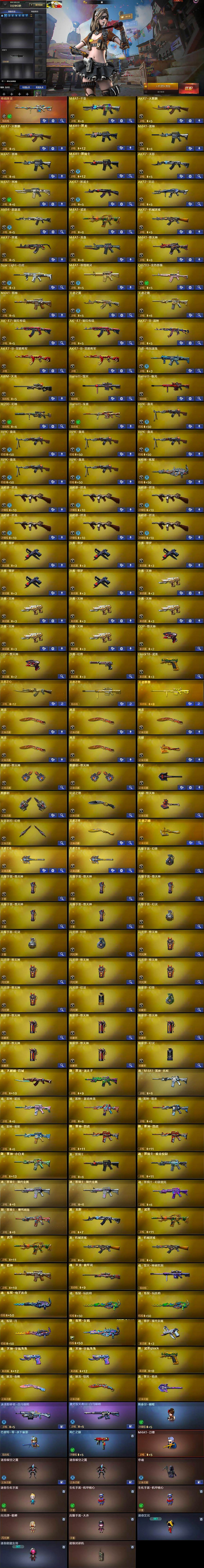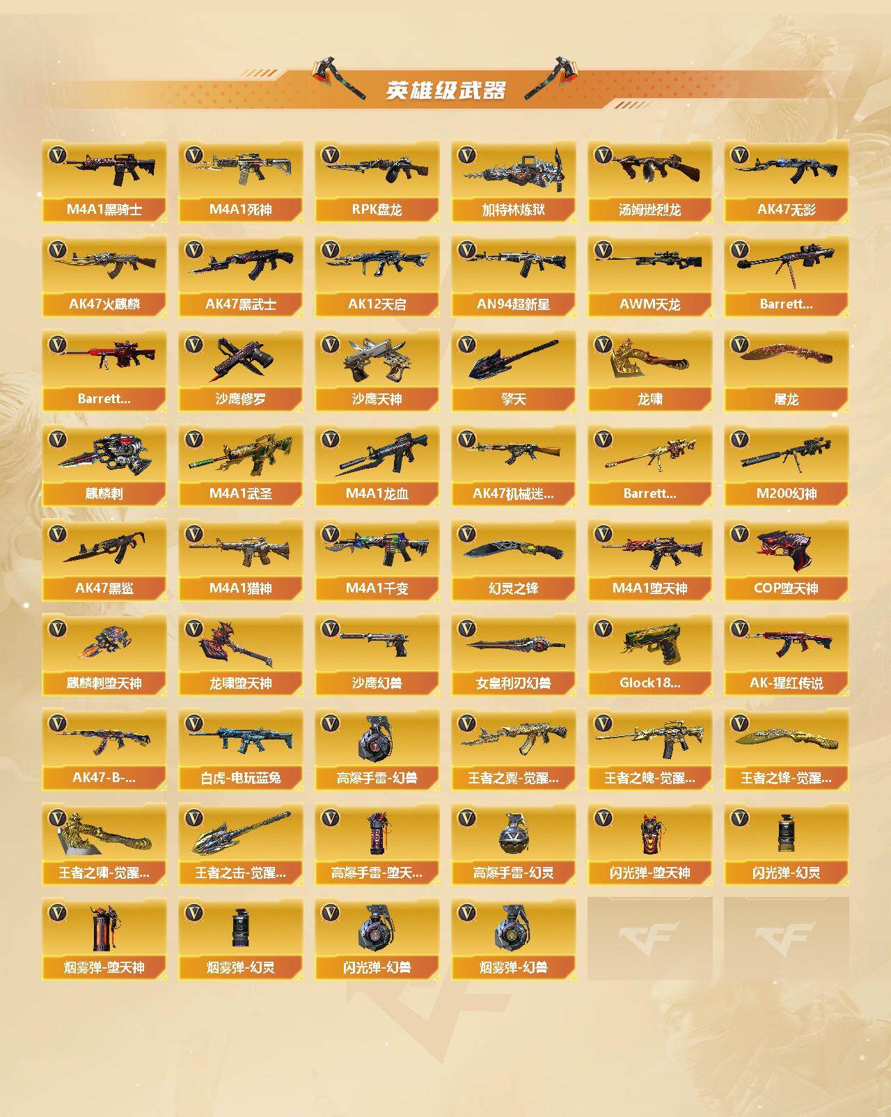 【英雄级武器】:M4A1-千变,AK47-火麒麟*2,M4A1-黑龙,M4A1-雷神*2,M4A1-黑骑士,AK47-无影,M4A1-死神,AK47-黑武士,AK12-天启,AN94-超新星,M4A1-武圣,AK47-机械迷城,AK47-黑鲨,M4A1-龙血,M4A1-堕天神,Scar Light-白虎,M4A1-玫瑰精灵,QBZ03-金色蔷薇,M4A1-猎神,王者之翼-觉醒版,王者之魄-觉醒版,AK-47-猩红传说*2,AK47-B-战神,AK47-B-常胜将军*2,白虎-电玩蓝兔,AWM-天龙,Barrett-毁灭,Barrett-极光,M200-幻神,Barrett-朱雀,RPK-盘龙*6,加特林-炼狱,汤姆逊-烈龙*6,沙鹰-修罗*5,沙鹰-天神*6,COP-堕天神*2,沙鹰-幻兽,Glock18-武圣,屠龙*5,龙啸,麒麟刺-堕天神*2,擎天,麒麟刺,幻灵之锋,龙啸-堕天神,女皇利刃-幻兽,王者之锋-觉醒版,王者之啸-觉醒版,王者之击-觉醒版*2,高爆手雷-幻兽,高爆手雷-堕天神*5