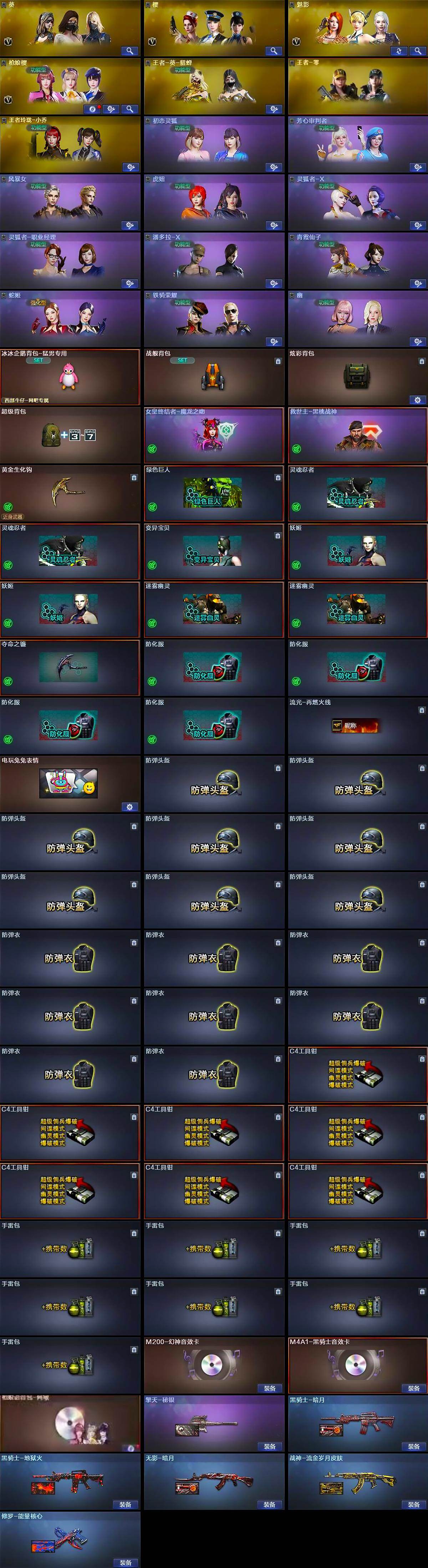 - [15243026]四川一区-55V-7王者-1炫金 【传说武器】:传说圣灵 【热门武器】:传说圣灵,QBZ03-金色蔷薇,M200-幻神,死亡之眼,M4A1-黑骑士,汤姆逊-烈龙*6,加特林-炼狱,斯泰尔-蝴蝶,USP-雷暴,COP-堕天神,沙鹰-修罗*2,高爆手雷-幻兽 【王者炫金武器】:炫金黑龙 【音效卡】:M4A1-黑龙音效卡,M4A1-黑骑士音效卡 【皮肤】:雷神-暗月,雷神-耀金皮肤,雷神-源计划2.0专属 皮肤,火麒麟-平天大圣,毁灭耀金皮肤,毁灭-英雄计划 皮肤,黑龙-暗月,AK47-B-常胜将军-孙权,天龙-秘银,AWM-天龙-传奇70KG,极光-能量核心,修罗-能量核心,修罗-星空,擎天-秘银 【角色】:葵,王者-葵-貂蝉,奇洋探员,风暴女,娟娟,猎狐者-追月,0号玩家,灵狐者-X,萌儿,斯沃特-X,兔囡囡,维纳斯,夜玫瑰-宠粉 【人偶武器】:斯泰尔-蝴蝶,巴雷特-零-水下丽影,加特林-机械猎手,M37-葵*2,COP-旗袍,生化手雷-机甲核心,闪光弹-小乔,闪光弹-貂蝉,高爆手雷-大乔 【暴走生化】:死亡之眼 【挑战大师】:机甲撕裂者III 【英雄级武器】:AK47-火麒麟,M4A1-黑龙,M4A1-雷神,M4A1-黑骑士,M4A1-死神,AK47-黑武士,M4A1-堕天神,QBZ03-金色蔷薇,王者之影-觉醒版,王者之魄-觉醒版,王者之烈-觉醒版,QBZ-03-王者蔷薇-觉醒版,AWM-天龙,Barrett-毁灭,Barrett-极光,M200-幻神,加特林-炼狱,汤姆逊-烈龙*6,沙鹰-修罗*2,沙鹰-天神*2,USP-雷暴,COP-堕天神,柯尔特-竞技荣光*2,沙鹰-幻兽,屠龙*2,龙啸,麒麟刺-堕天神,擎天,麒麟刺,幻灵之锋,龙啸-堕天神,女皇利刃-幻兽,王者之击-觉醒版,高爆手雷-幻兽,高爆手雷-堕天神*4,高爆手雷-幻灵,高爆手雷-竞技荣光,闪光弹-幻兽,闪光弹-幻灵*2,闪光弹-竞技荣光,烟雾弹-幻兽,烟雾弹-幻灵,烟雾弹-竞技荣光,M4A1-赤狱骑士 【道具】:CFS限定背包,云山科技背包,奇洋探员-海龟背包,女皇终结者-背包,战舰背包,炫彩背包,超级背包,女皇终结者-魔龙之吻,救世主-黑桃战神,黄金生化钩,绿色巨人,灵魂忍者,变异宝贝,迷雾幽灵,生化弹匣,夺命之镰,防化服*3,枪王排位28赛季金色流光,斯沃特表情,EP战队名片,EP战队喷图,防