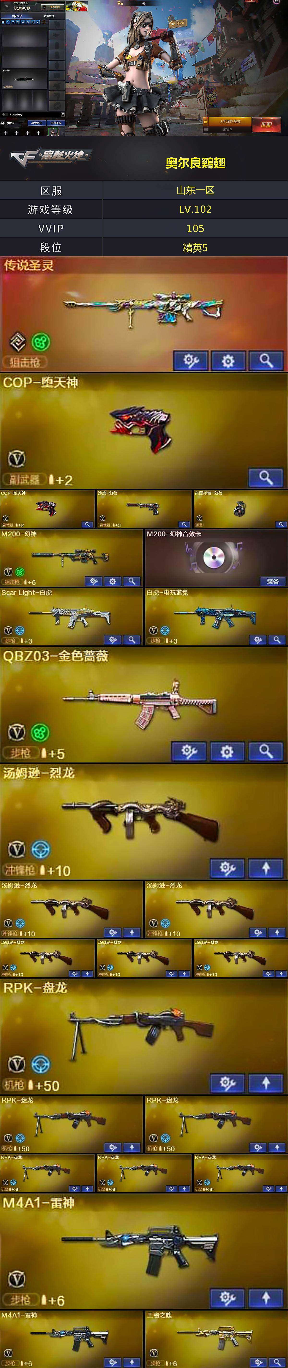 【热门武器】:传说圣灵,QBZ03-金色蔷薇,Scar Light-白虎,M200-幻神,死亡之眼,白虎-电玩蓝兔,M4A1-黑骑士,汤姆逊-烈龙*6,RPK-盘龙*6,加特林-炼狱,斯泰尔-蝴蝶,COP-堕天神*2,沙鹰-修罗*5,金刚伞,高爆手雷-幻兽
