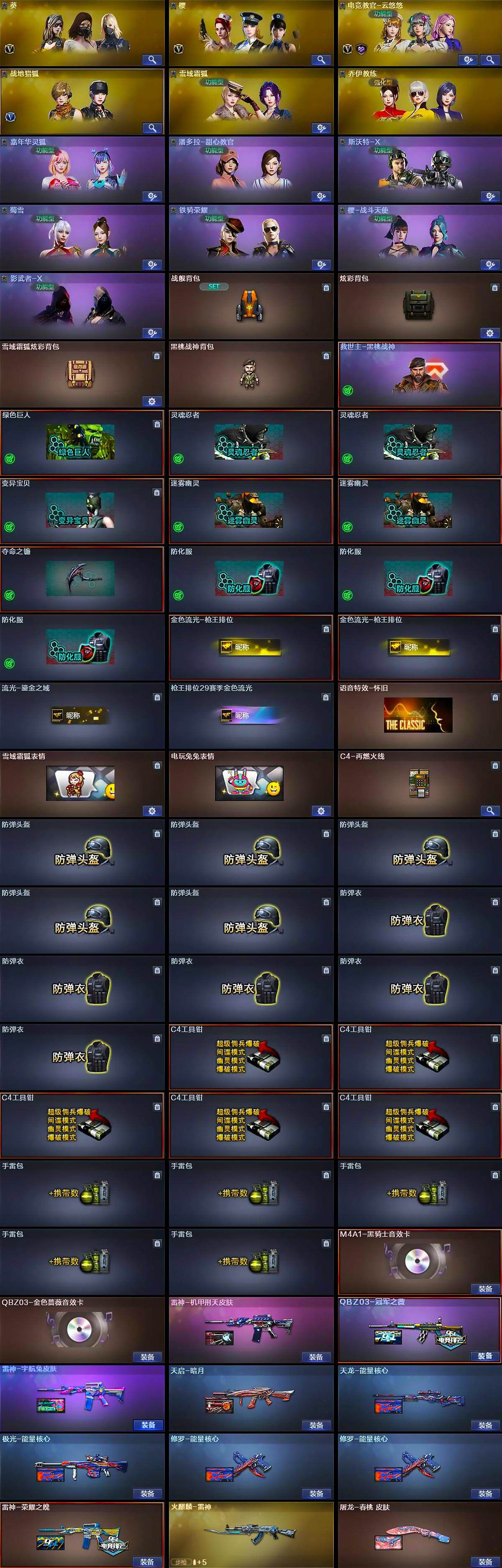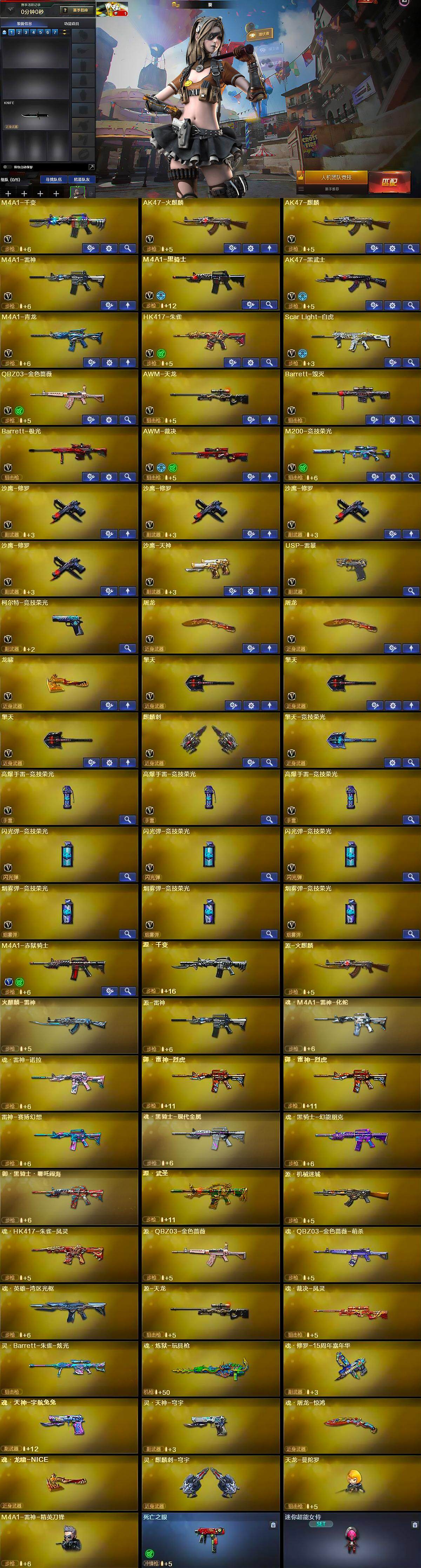 - [11325719]3粉装 5特效枪 12印记 可二次 可修改实名 优质装备:M16A4垂柳戏鸭,SCAR-L-锦绣绵绵,M416电玩时刻,Kar98K-巳巳如意 热门装扮:朗月武圣,未来歌姬,创世·救赎,鹰眼刺客,梦魇先生 稀有枪皮:DP-28-豹影疾电 五级特效枪:五级Kar98K-巳巳如意,五级DP-28-豹影疾电,五级M416-电玩时刻,五级SCAR-L-锦绣绵绵,五级M16A4-垂柳戏鸭 紫色装扮:田园牧歌,轻风白浪,SS22特训,SS23特训,幻彩翩翩,妙红点点,龙舌兰冰茶,白兰地假日,娇憨猪猪,萌趣咩咩,SS21特训,浪漫假日,SS31特训套装,云霄猎人,人气偶像,军械专家,冰川特警,冷焰舞者,旭日情侣,SS33特训套装,顶瓜瓜,SS20特训,猎梦纪元,SS19特训,甜心亚梦,虚音幻奏,SS18特训,都市魅力,酒红色名流,野性战心,长空猛禽,雨林探路者,雪山征服者,霓虹街区,霸义无双,青年教官,青春校园,风暴特警,缤纷果语,苍穹猎鹰,荣耀,蓝彩潮人,蓝色运动,血色贵族,街头潮人,超能勇士,绛羽幽主,飞行日记,龙腾端午,魅力单车,鹤鸣,麻辣教官,黄色伏地魔,黄色名流,黄色运动,黑色伏地魔,龙的传人,龟仙人,冰河战士,蝶变,香桃花海,沙漠毒蛇,极地朋克,极速红龙,柠萌假日,橘黑制服,沙漠兵团,活力之心,派对绅士,海岛探路者,涂山之恋,深蓝色名流,清新柠檬,幻影武者,坚韧舞者,完美偶像,帅气教官,幻世战舞者,战地督导,探宝勇士,湖蓝色名流,绮丽涂鸦,甜蜜菠萝,白熊同盟,白色伏地魔,破晓战魂,破蛋小黄鸡,甜蜜告白,空岛之星,空投萌叽,竞技达人朋克,红色运动,王牌教练,牛气冲天,灰色格斗者,灼焰舞者,炫蓝之夏,热血骑手,燃烧卡路里,牛气满满,猛禽,特战英豪,特殊使命,特训学院,猎鹰,SS29特训,拉斐尔,星途旅人,创世·幻影,纯真浪花,热情海星,SS28特训,卖崽青蛙,创世·追猎,冰公主,红潮炫舞,鱼渊荷华,玉兔迎春,燕燕于飞,竞技名士,许七安,情公主,惊鸿侠骨,甜梦熊熊,神气柴柴,懵萌河马,SS24特训(SS24特训套装),SS25特训,绝对偶像,锦衣飞扬,粉红小猪,焰鹰斗篷,幻羽潜行,SS27特训,SS26特训,春光漫游,快闪甜心,贝斯之夜,智谋强哥,精神漫游,格斗专家,核芯基因,大橘大利,耀粉歌者,SS32特训服(SS32特训套装),青玉碎影,绯格组合,萌黄之夏,白糯汤圆,恋