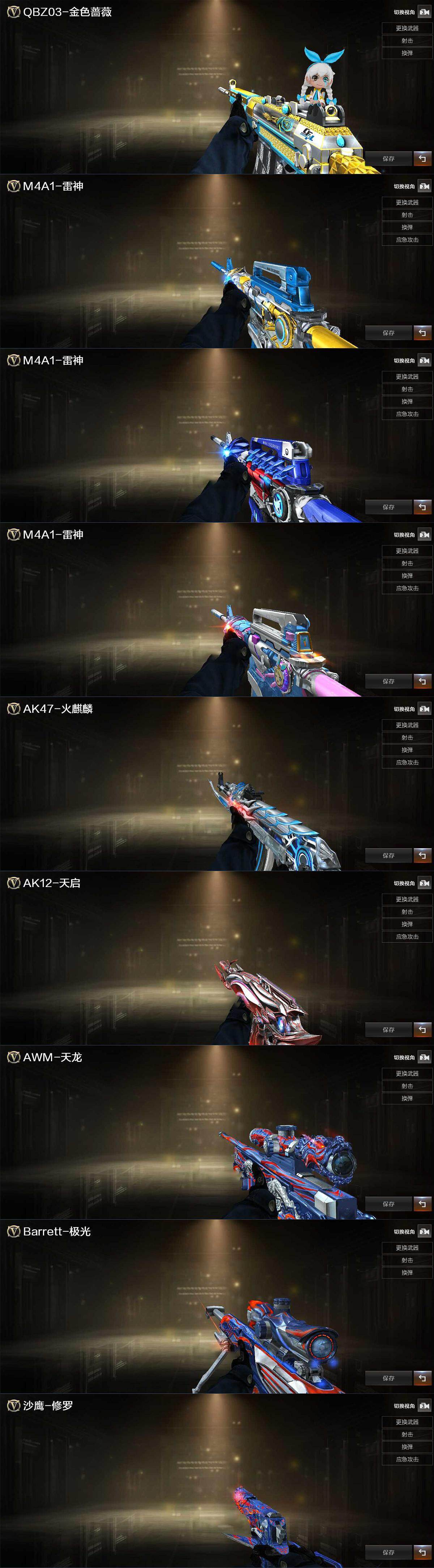 【皮肤】:QBZ03-冠军之薇,雷神-荣耀之魄,雷神-机甲刑天皮肤,雷神-宇航兔皮肤,火麒麟-雷神,天启-暗月,天龙-能量核心,极光-能量核心,修罗-能量核心*2,屠龙-春桃 皮肤