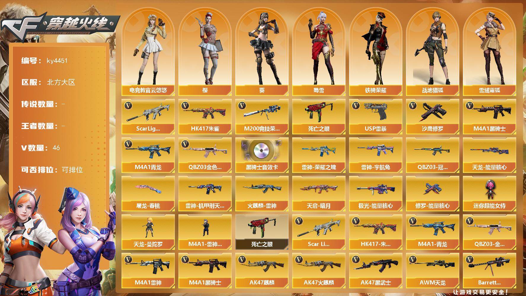 [15248186]北方大区-46V-0王者-0炫金 【热门武器】:QBZ03-金色蔷薇,Scar Light-白虎,HK417-朱雀,M4A1-青龙,M200-竞技荣光,死亡之眼,M4A1-黑骑士,USP-雷暴,沙鹰-修罗*4 【音效卡】:M4A1-黑骑士音效卡 【皮肤】:QBZ03-冠军之薇,雷神-荣耀之魄,雷神-机甲刑天皮肤,雷神-宇航兔皮肤,火麒麟-雷神,天启-暗月,天龙-能量核心,极光-能量核心,修罗-能量核心*2,屠龙-春桃 皮肤 【角色】:葵,樱,电竞教官-云悠悠,战地猎狐,雪域霜狐,乔伊教练,嘉年华灵狐,潘多拉-甜心教官,斯沃特-X,蜀雪,铁骑荣耀,樱-战斗天使,影武者-X 【人偶武器】:天龙-曼陀罗,M4A1-雷神-精英刀锋,迷你超能女侍 【暴走生化】:死亡之眼 【英雄级武器】:M4A1-千变,AK47-火麒麟,AK47-麒麟,M4A1-雷神,M4A1-黑骑士,AK47-黑武士,M4A1-青龙,HK417-朱雀,Scar Light-白虎,QBZ03-金色蔷薇,AWM-天龙,Barrett-毁灭,Barrett-极光,AWM-裁决,M200-竞技荣光,沙鹰-修罗*4,沙鹰-天神,USP-雷暴,柯尔特-竞技荣光,屠龙*2,龙啸,擎天*3,麒麟刺,擎天-竞技荣光,高爆手雷-竞技荣光*3,闪光弹-竞技荣光*3,烟雾弹-竞技荣光*3,M4A1-赤狱骑士 【道具】:战舰背包,炫彩背包,雪域霜狐炫彩背包,黑桃战神背包,救世主-黑桃战神,绿色巨人,灵魂忍者*2,变异宝贝,迷雾幽灵*2,夺命之镰,防化服*3,金色流光-枪王排位*2,流光-鎏金之域,枪王排位29赛季金色流光,语音特效-怀旧,雪域霜狐表情,电玩兔兔表情,C4-再燃火线,防弹头盔*5,防弹衣*5,C4工具钳*5,手雷包*5 【特殊枪械】:1白虎,1黑骑士