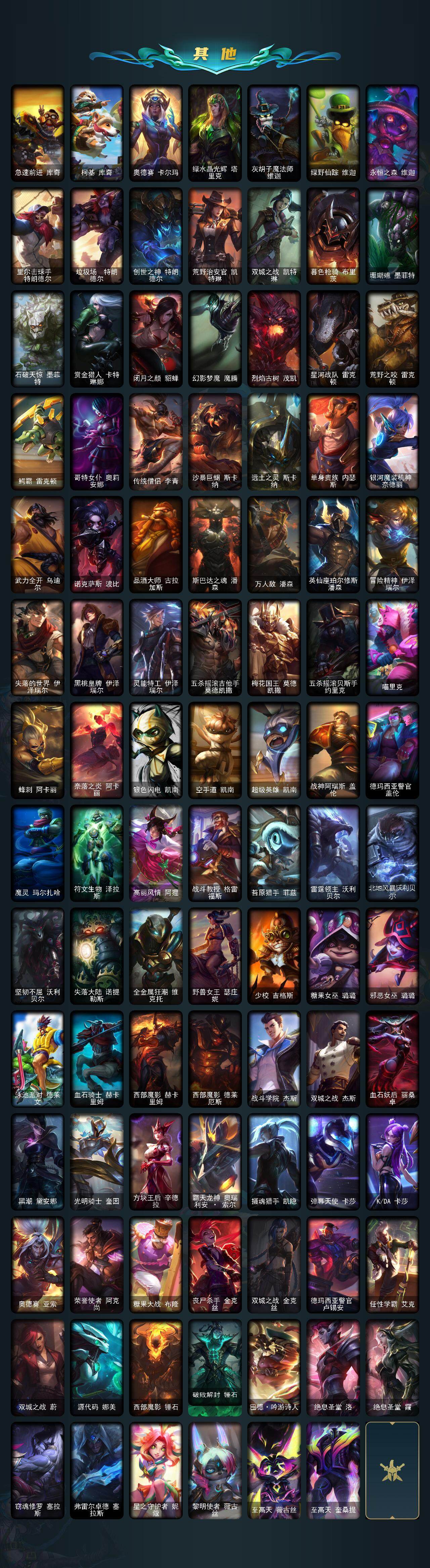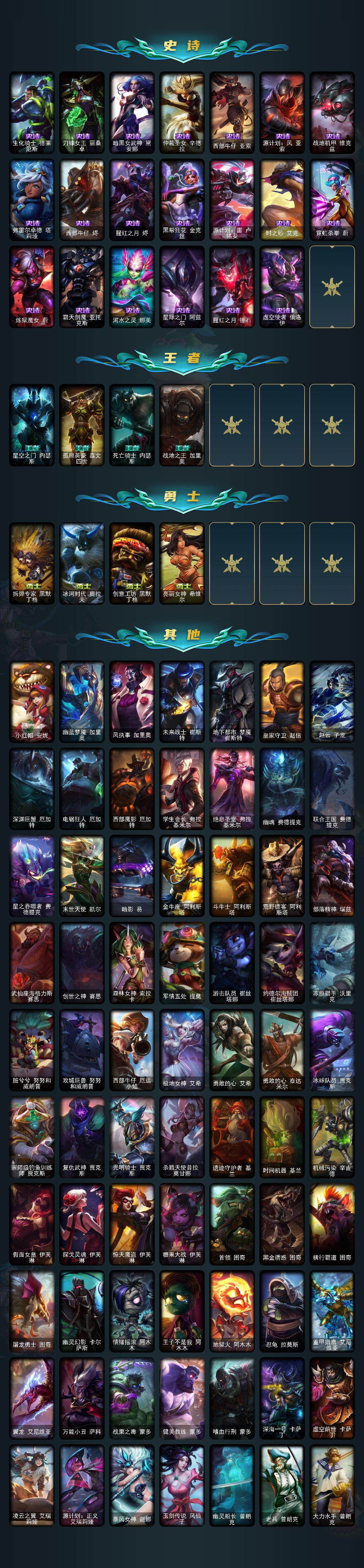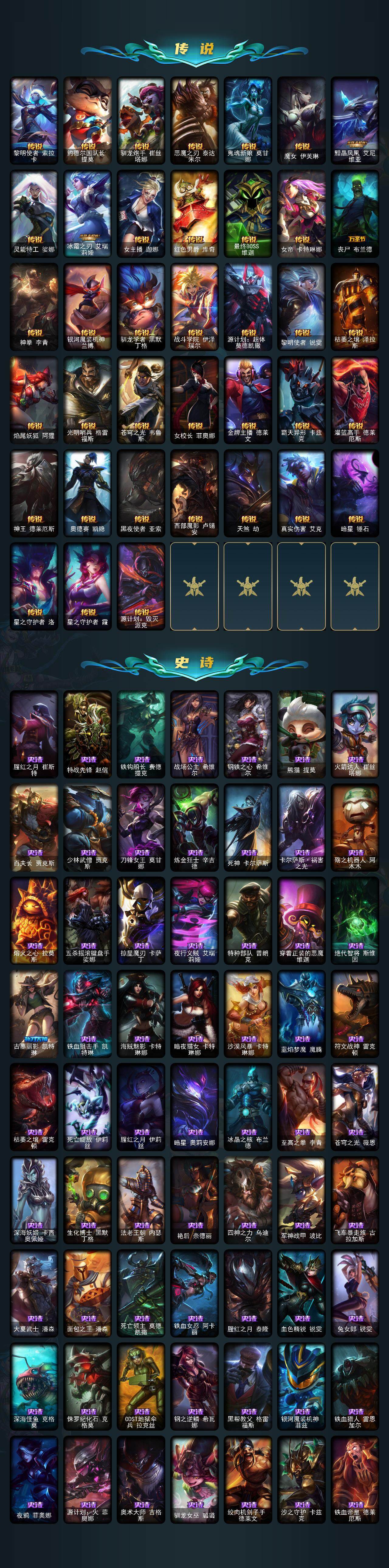 【传说皮肤】:铁哥们儿奥拉夫,地狱之门卫士加里奥,战地机甲厄加特,大天使长米迦勒凯尔,源计划林易,恶魔男爵瑞兹,霸天零式赛恩,黎明使者索拉卡,约德尔国队长提莫,驯龙炮手崔丝塔娜,恶魔之刃泰达米尔,鬼魂新娘莫甘娜,魔女伊芙琳,黯晶凤凰艾尼维亚,灵能特工娑娜,冰霜之刃艾瑞莉娅,女主播迦娜,红色男爵库奇,最终BOSS维迦,女帝卡特琳娜,丧尸布兰德,神拳李青,银河魔装机神兰博,驯龙学者黑默丁格,战斗学院伊泽瑞尔,源计划超体莫德凯撒,黎明使者锐雯,枯萎之壤泽拉斯,焰尾妖狐阿狸,光明哨兵格雷福斯,苍穹之光韦鲁斯,女校长菲奥娜,金牌主播德莱文,霸天异形卡兹克,灌篮高手德莱厄斯,神王德莱厄斯,奥德赛凯隐,
