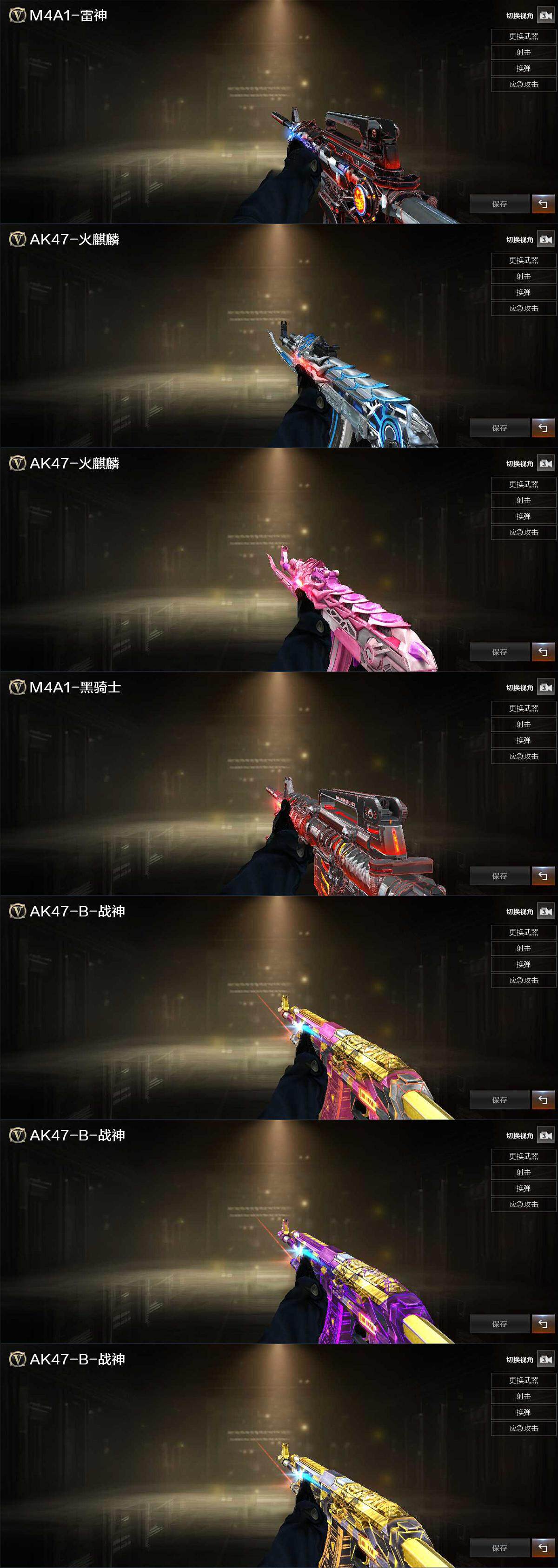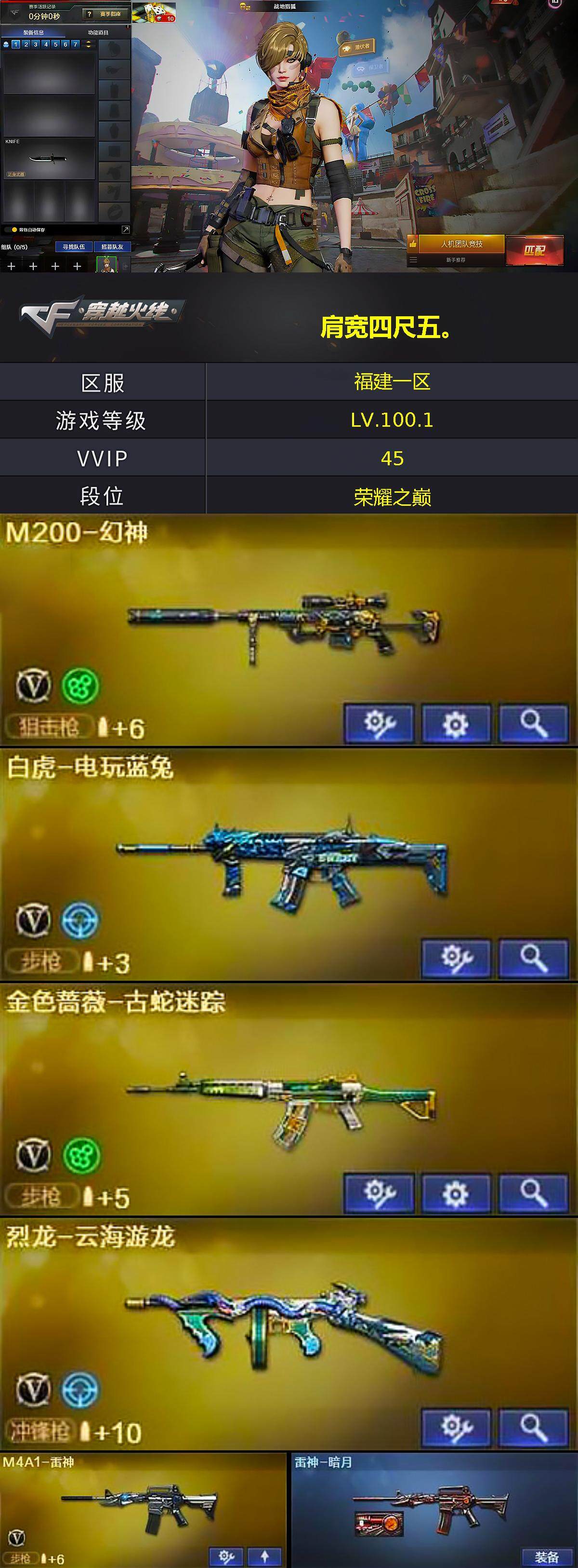 【热门武器】:M4A1-青龙,M200-幻神,金色蔷薇-古蛇迷踪,修罗-古蛇迷踪,白虎-电玩蓝兔,M4A1-黑骑士,沙鹰-修罗