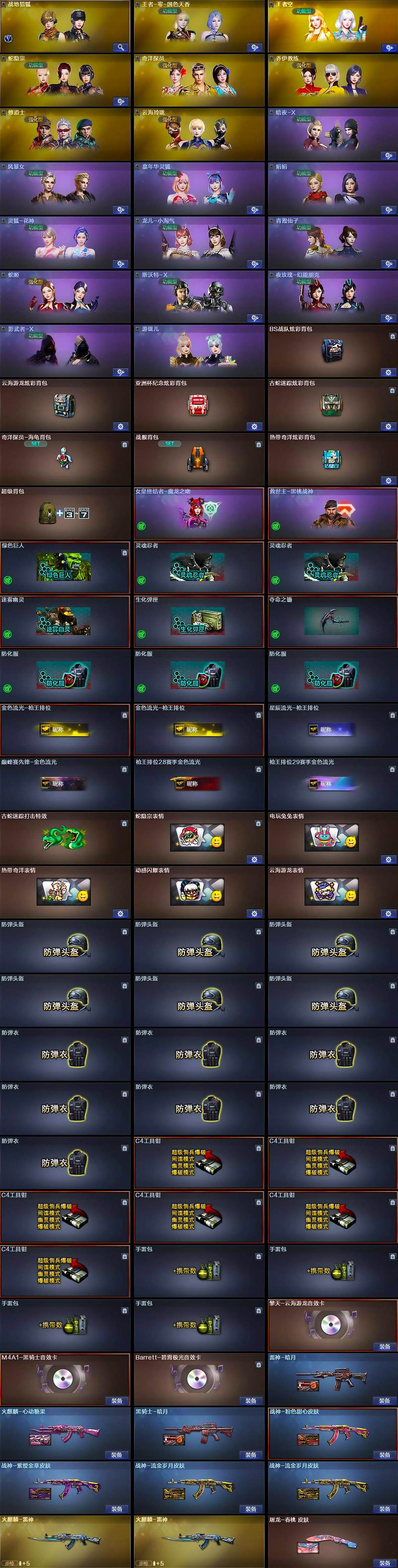 【道具】:BS战队炫彩背包,云海游龙炫彩背包,亚洲杯纪念炫彩背包,古蛇迷踪炫彩背包,奇洋探员-海龟背包,战舰背包,热带奇洋炫彩背包,超级背包,女皇终结者-魔龙之吻,救世主-黑桃战神,绿色巨人,灵魂忍者*2,迷雾幽灵,生化弹匣,夺命之镰,防化服*3,金色流光-枪王排位*2,星辰流光-枪王排位,巅峰赛先锋-金色流光,枪王排位28赛季金色流光,枪王排位29赛季金色流光,古蛇迷踪打击特效,蛇隐宗表情,电玩兔兔表情,热带奇洋表情,动感闪耀表情,云海游龙表情