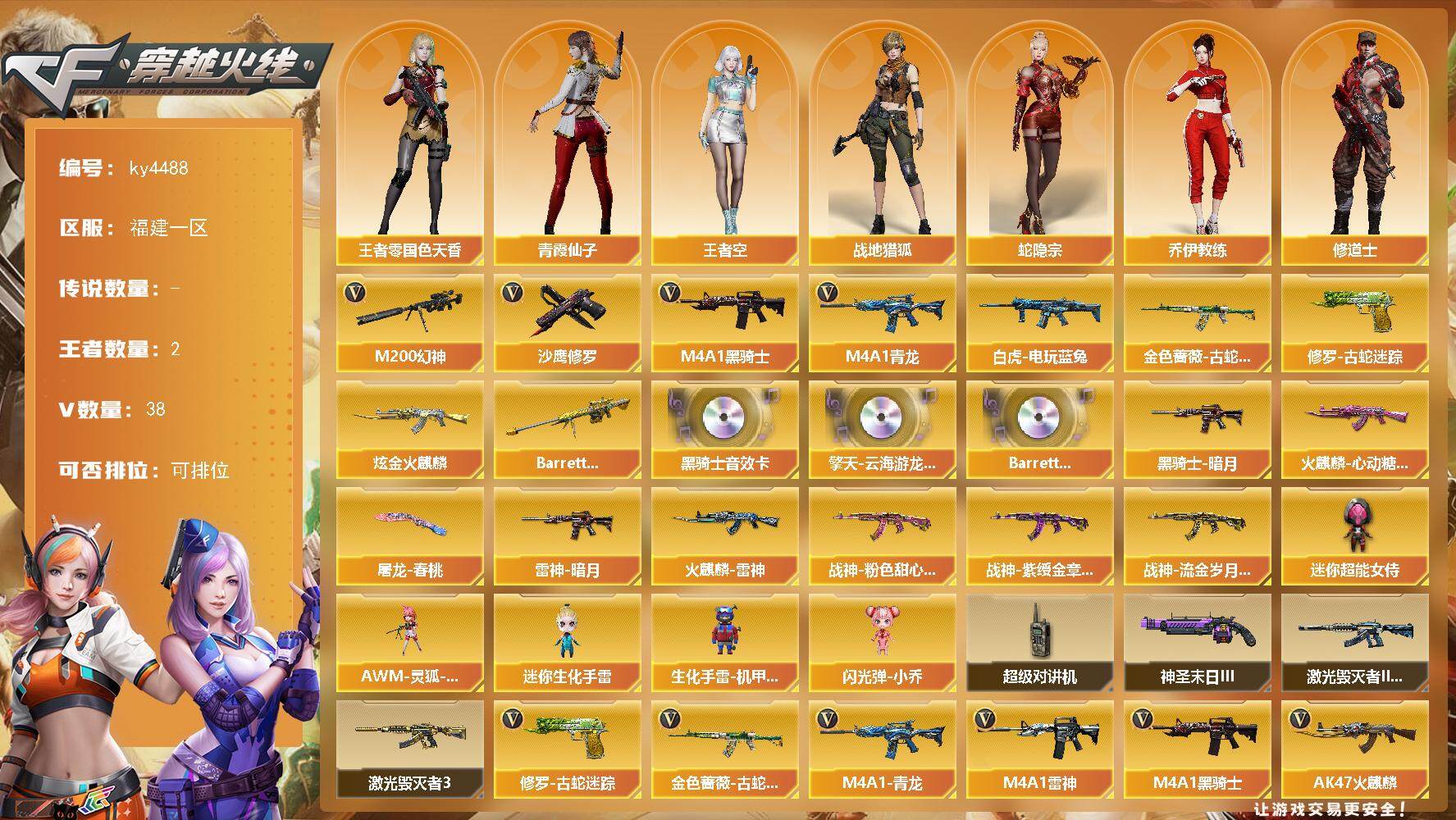 [15248562]福建一区-38V-2王者-1炫金 【热门武器】:M4A1-青龙,M200-幻神,金色蔷薇-古蛇迷踪,修罗-古蛇迷踪,白虎-电玩蓝兔,M4A1-黑骑士,沙鹰-修罗 【王者炫金武器】:Barrett-雷霆王者,炫金火麒麟 【音效卡】:擎天-云海游龙音效卡,M4A1-黑骑士音效卡,Barrett-碧霄极光音效卡 【皮肤】:雷神-暗月,火麒麟-雷神*2,火麒麟-心动糖果,黑骑士-暗月,战神-粉色甜心皮肤,战神-紫绶金章皮肤,战神-流金岁月皮肤*2,屠龙-春桃 皮肤 【角色】:战地猎狐,王者-零-国色天香,王者空,蛇隐宗,奇洋探员,乔伊教练,修道士,云海玲珑,暗夜-X,风暴女,嘉年华灵狐,娟娟,灵狐-花神,龙儿-小淘气,青霞仙子,蛇姬,斯沃特-X,夜玫瑰-幻能朋克,影武者-X,游珑儿 【人偶武器】:AWM-灵狐-15周年嘉年华,迷你生化手雷,生化手雷-机甲核心,闪光弹-小乔,迷你超能女侍 【暴走生化】:超级对讲机 【挑战大师】:激光毁灭者III-白马银枪*2,激光毁灭者III,神圣爆裂者-末日III 【英雄级武器】:AK47-火麒麟,M4A1-雷神,M4A1-黑骑士,AN94-超新星,M4A1-青龙,无影-神兵利器,黑武士-锦绣游龙,超新星-热带奇洋,金色蔷薇-古蛇迷踪,烈火-动感闪耀,AK-47-猩红传说*4,AK47-B-战神*2,黑骑士-海王,白虎-电玩蓝兔,M200-幻神,烈龙-云海游龙,沙鹰-修罗,天神-动感闪耀,修罗-古蛇迷踪,幻灵之锋,屠龙-动感闪耀,擎天-云海游龙,龙啸-热带奇洋,高爆手雷-幻灵,手雷-动感闪耀,手雷-云海游龙,手雷-热带奇洋,高爆手雷-古蛇迷踪,闪光弹-幻灵,闪光弹-雷霆王者-觉醒版,烟雾弹-幻灵*3,烟雾弹-古蛇迷踪,M4A1-赤狱骑士,M4A1-苍鸣雷神,AWM-昌龙,Barrett-碧霄极光 【道具】:BS战队炫彩背包,云海游龙炫彩背包,亚洲杯纪念炫彩背包,古蛇迷踪炫彩背包,奇洋探员-海龟背包,战舰背包,热带奇洋炫彩背包,超级背包,女皇终结者-魔龙之吻,救世主-黑桃战神,绿色巨人,灵魂忍者*2,迷雾幽灵,生化弹匣,夺命之镰,防化服*3,金色流光-枪王排位*2,星辰流光-枪王排位,巅峰赛先锋-金色流光,枪王排位28赛季金色流光,枪王排位29赛季金色流光,古蛇迷踪打击特效,蛇隐宗表情,电玩兔兔表情,热带奇洋表情,动感闪耀表情,云海游龙表情