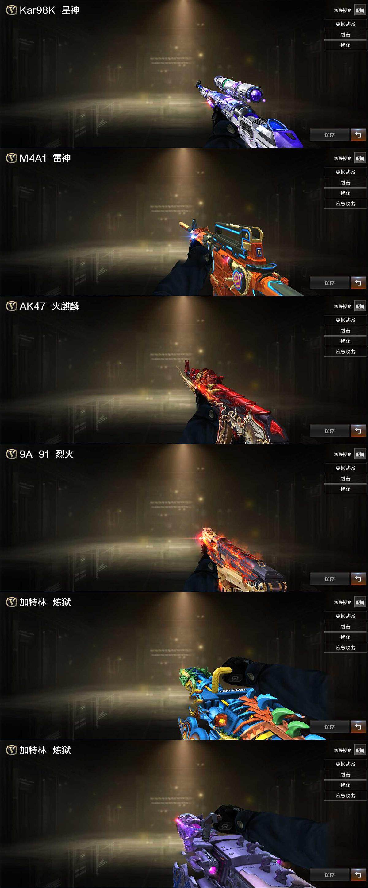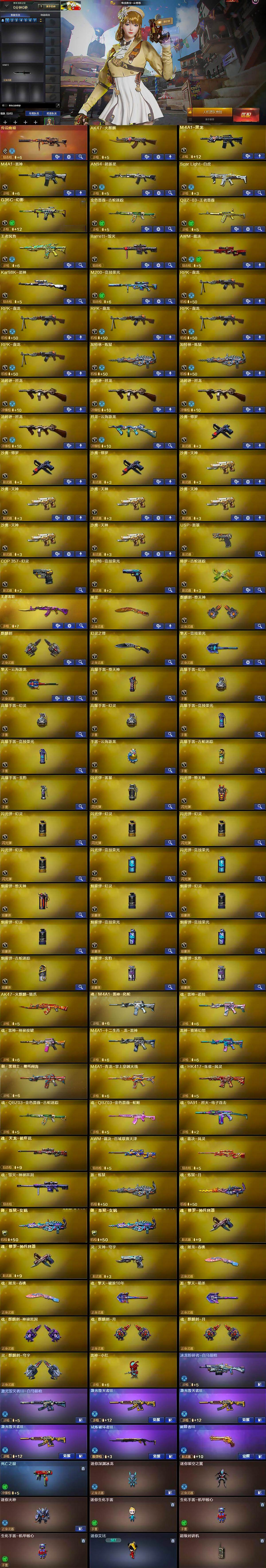 【英雄级武器】:AK47-火麒麟,M4A1-黑龙,M4A1-雷神,AN94-超新星,Scar Light-白虎,G36C-幻影,金色蔷薇-古蛇迷踪,QBZ-03-王者蔷薇-觉醒版,王者风势-觉醒版,Barrett-毁灭,AWM-裁决,Kar98K-星神,M200-竞技荣光,RPK-盘龙*5,加特林-炼狱*2,汤姆逊-烈龙*4,烈龙-云海游龙,沙鹰-修罗*3,沙鹰-天神*6,USP-雷暴,COP 357-幻灵,柯尔特-竞技荣光,修罗-古蛇迷踪,屠龙,麒麟刺-堕天神,麒麟刺,幻灵之锋,擎天-竞技荣光,擎天-云海游龙,高爆手雷-堕天神,高爆手雷-幻灵*3,高爆手雷-竞技荣光*2,手雷-云海游龙,高爆手雷-古蛇迷踪,高爆手雷-玄豹,闪光弹-雷暴,闪光弹-堕天神,闪光弹-幻灵*4,闪光弹-竞技荣光*2,烟雾弹-堕天神,烟雾弹-幻灵*3,烟雾弹-竞技荣光*2,烟雾弹-古蛇迷踪,烟雾弹-玄豹*2