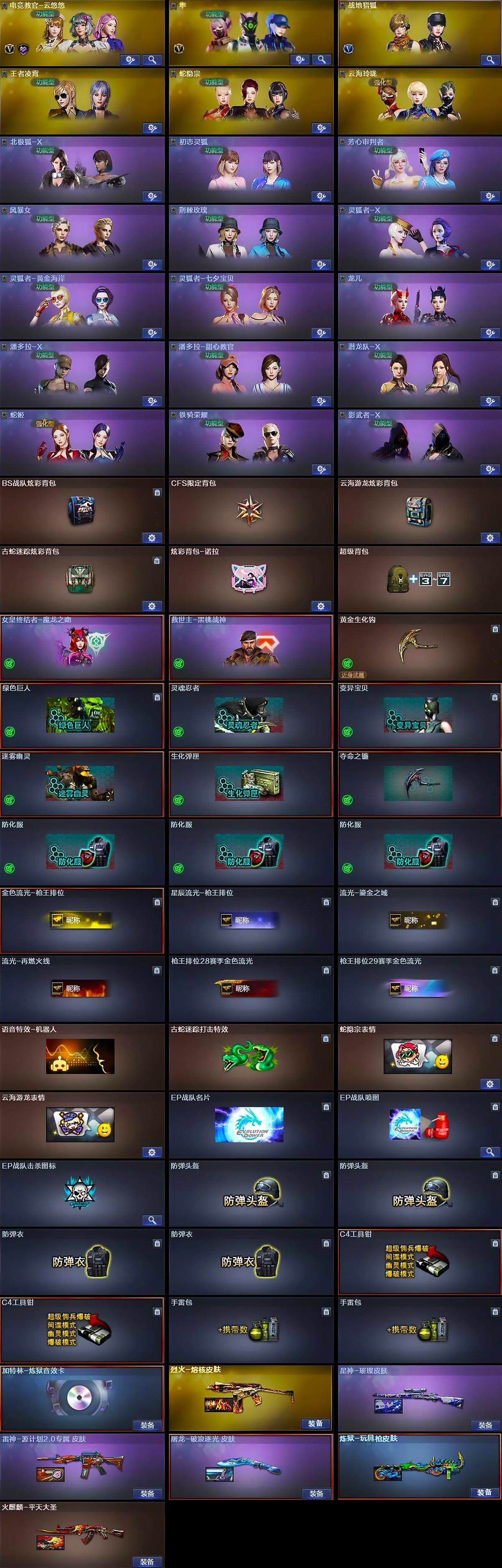 【道具】:BS战队炫彩背包,CFS限定背包,云海游龙炫彩背包,古蛇迷踪炫彩背包,炫彩背包-诺拉,超级背包,女皇终结者-魔龙之吻,救世主-黑桃战神,黄金生化钩,绿色巨人