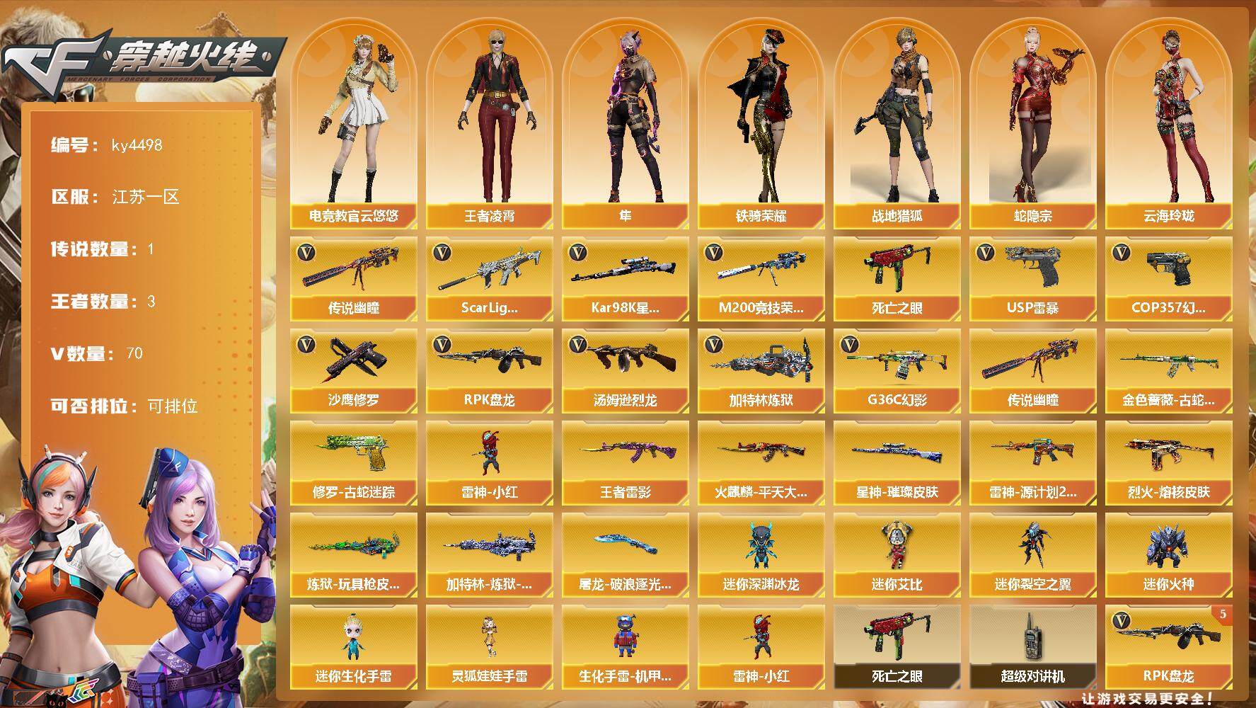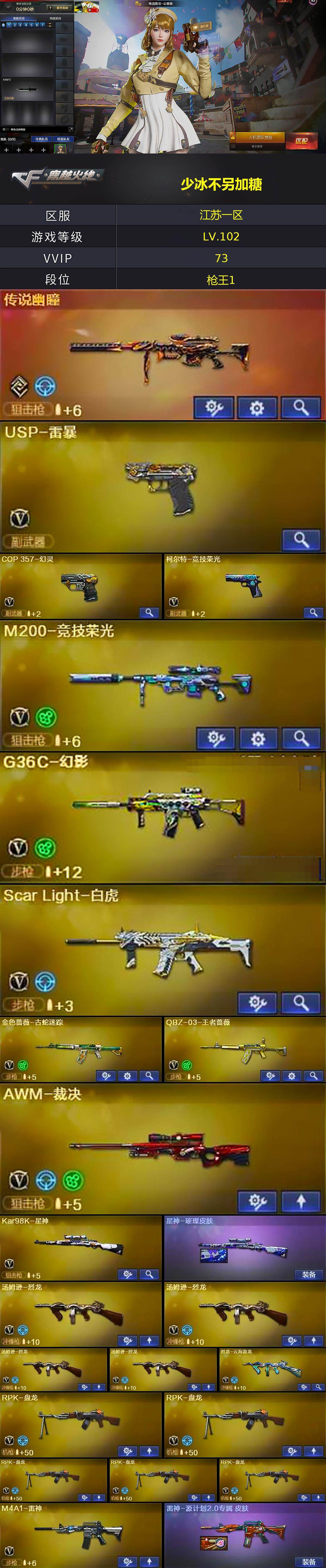 [15248658]江苏一区-70V-3王者-0炫金 【传说武器】:传说幽瞳 【热门武器】:传说幽瞳,G36C-幻影,Scar Light-白虎,金色蔷薇-古蛇迷踪,修罗-古蛇迷踪,M200-竞技荣光,死亡之眼,Kar98K-星神,汤姆逊-烈龙*4,RPK-盘龙*5,加特林-炼狱*2,雷神-小红,USP-雷暴,COP 357-幻灵,沙鹰-修罗*3 【王者炫金武器】:王者雷影 【皮肤】:星神-璀璨皮肤,雷神-源计划2.0专属 皮肤,火麒麟-平天大圣,烈火-熔核皮肤,炼狱-玩具枪皮肤,加特林-炼狱-钟馗皮肤,屠龙-破浪逐光 皮肤 【角色】:电竞教官-云悠悠,隼,战地猎狐,王者凌霄,蛇隐宗,云海玲珑,北极狐-X,初恋灵狐,芳心审判者,风暴女,荆棘玫瑰,灵狐者-X,灵狐者-黄金海岸,灵狐者-七夕宝贝,龙儿,潘多拉-X,潘多拉-甜心教官,潜龙队-X,蛇姬,铁骑荣耀,影武者-X 【人偶武器】:雷神-小红,迷你深渊冰龙,迷你裂空之翼,迷你火种,迷你生化手雷,生化手雷-机甲核心*2,迷你艾比,灵狐娃娃手雷 【暴走生化】:死亡之眼,超级对讲机 【挑战大师】:冰龙粉碎者-白马银枪,激光毁灭者III-白马银枪,激光毁灭者III*3,试炼破坏者III,阐释者III 【英雄级武器】:AK47-火麒麟,M4A1-黑龙,M4A1-雷神,AN94-超新星,Scar Light-白虎,G36C-幻影,金色蔷薇-古蛇迷踪,QBZ-03-王者蔷薇-觉醒版,王者风势-觉醒版,Barrett-毁灭,AWM-裁决,Kar98K-星神,M200-竞技荣光,RPK-盘龙*5,加特林-炼狱*2,汤姆逊-烈龙*4,烈龙-云海游龙,沙鹰-修罗*3,沙鹰-天神*6,USP-雷暴,COP 357-幻灵,柯尔特-竞技荣光,修罗-古蛇迷踪,屠龙,麒麟刺-堕天神,麒麟刺,幻灵之锋,擎天-竞技荣光,擎天-云海游龙,高爆手雷-堕天神,高爆手雷-幻灵*3,高爆手雷-竞技荣光*2,手雷-云海游龙,高爆手雷-古蛇迷踪,高爆手雷-玄豹,闪光弹-雷暴,闪光弹-堕天神,闪光弹-幻灵*4,闪光弹-竞技荣光*2,烟雾弹-堕天神,烟雾弹-幻灵*3,烟雾弹-竞技荣光*2,烟雾弹-古蛇迷踪,烟雾弹-玄豹*2 【道具】:BS战队炫彩背包,CFS限定背包,云海游龙炫彩背包,古蛇迷踪炫彩背包,炫彩背包-诺拉,超级背包,女皇终结者-魔龙之吻,救世主-黑桃战神,黄金生化钩,绿色巨人