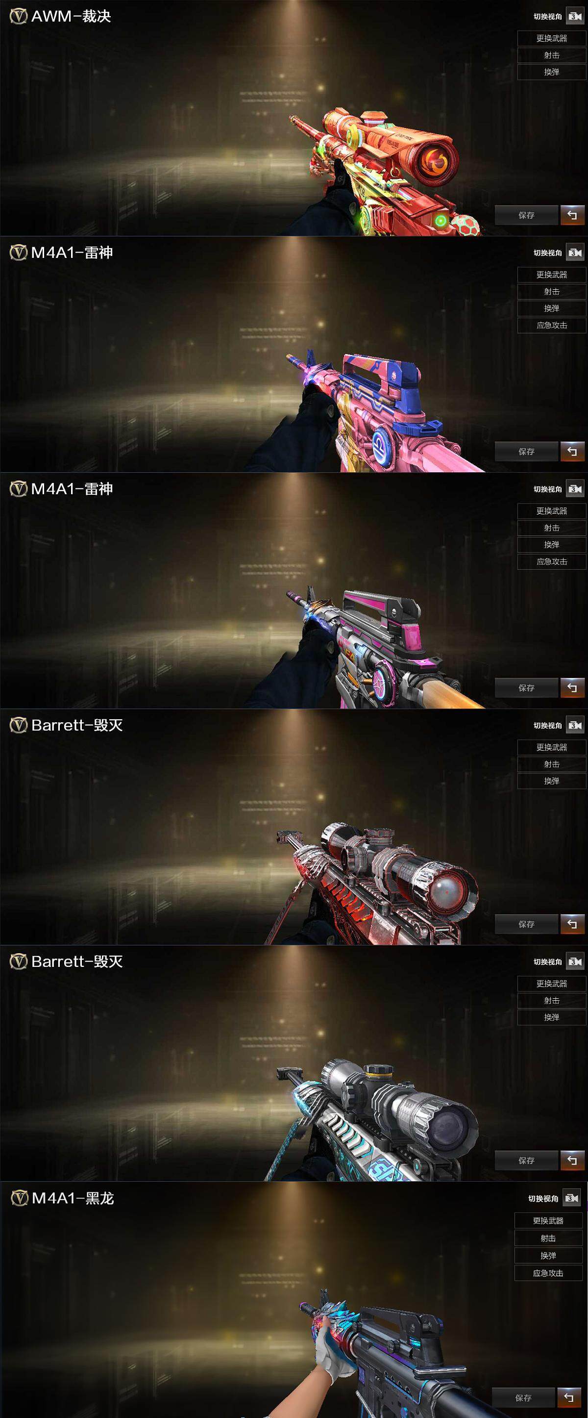 【音效卡】:Barrett-毁灭音效卡,Barrett-碧霄极光音效卡*2,炼狱-百战金芒-庆典舞曲音效卡,沙鹰-修罗-盛典舞曲音效卡,柯尔特-百战金芒-庆典舞曲音效卡,AWM-昌龙-怀旧音效卡