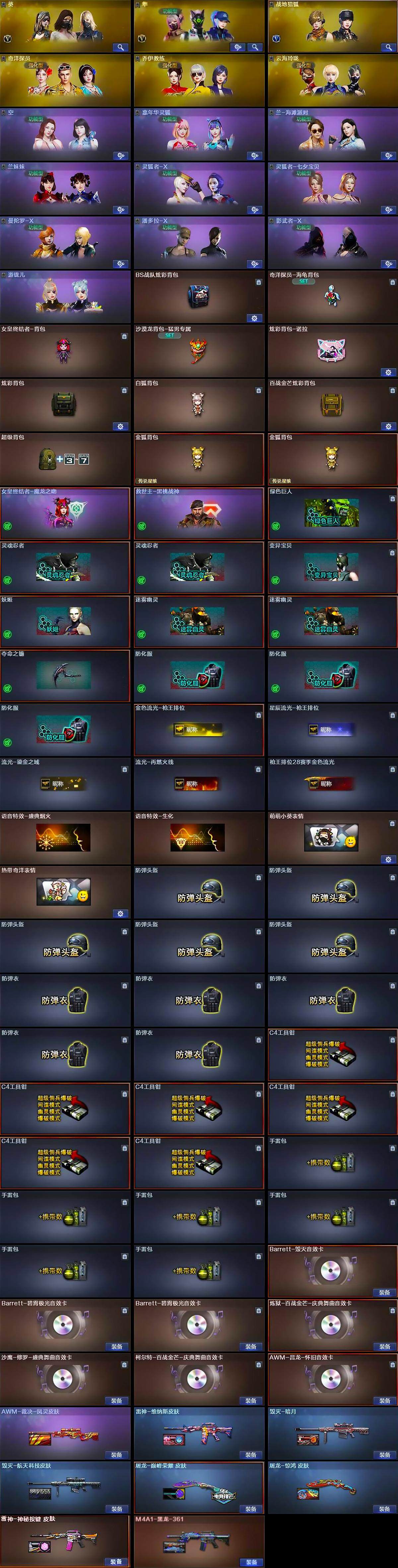 【道具】:BS战队炫彩背包,奇洋探员-海龟背包,女皇终结者-背包,沙漠龙背包-猛男专属,炫彩背包-诺拉,炫彩背包,白狐背包,百战金芒炫彩背包,超级背包,金狐背包*2,女皇终结者-魔龙之吻,救世主-黑桃战神,绿色巨人,灵魂忍者*2,变异宝贝,妖姬,迷雾幽灵*2,夺命之镰,防化服*3,金色流光-枪王排位,星辰流光-枪王排位,流光-鎏金之域,流光-再燃火线,枪王排位28赛季金色流光,语音特