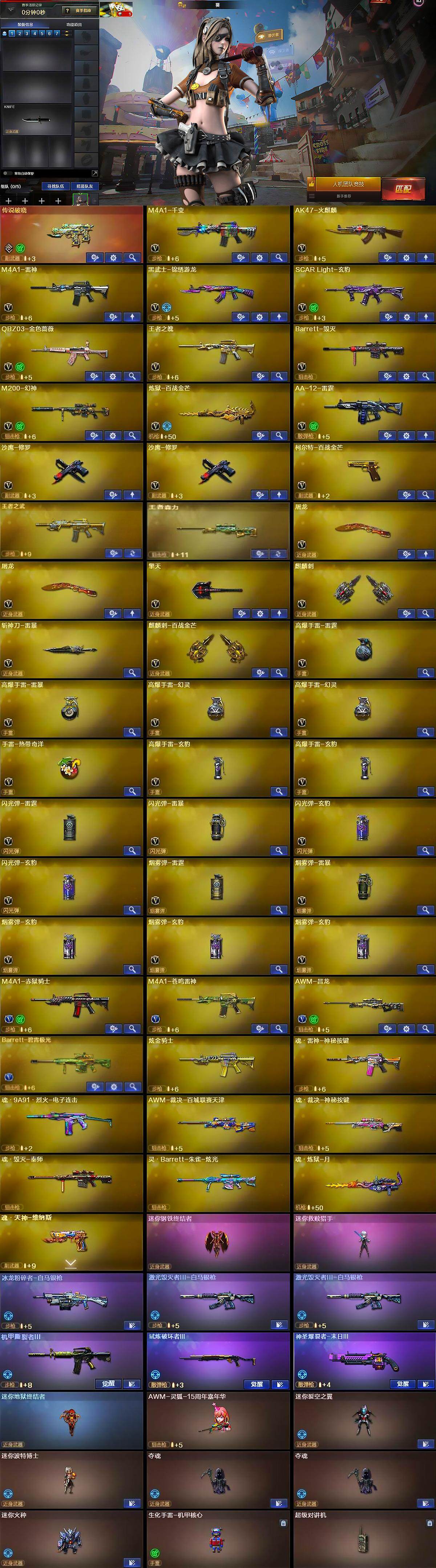 【英雄级武器】:M4A1-千变,AK47-火麒麟,M4A1-雷神,黑武士-锦绣游龙,SCAR Light-玄豹,QBZ03-金色蔷薇,王者之魄-觉醒版,Barrett-毁灭,M200-幻神,炼狱-百战金芒,AA-12-雷霆,沙鹰-修罗*2,柯尔特-百战金芒,屠龙*2,擎天,麒麟刺,斩神刀-雷暴,麒麟刺-百战金芒,高爆手雷-雷霆,高爆手雷-雷暴,高爆手雷-幻灵*2,手雷-热带奇洋,高爆手雷-玄豹*2,闪光弹-雷霆,闪光弹-雷暴,闪光弹-玄豹*2,烟雾弹-雷霆,烟雾弹-雷暴,烟雾弹-玄豹*3,M4A1-赤狱骑士,M4A1-苍鸣雷神,AWM-昌龙,Barrett-碧霄极光