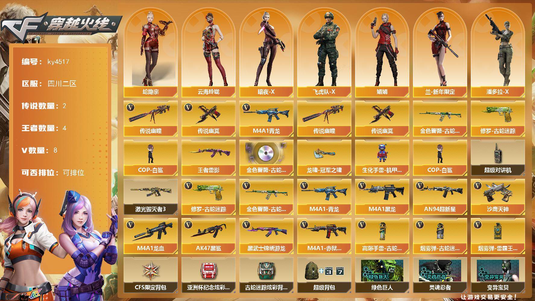[15248926]四川二区-8V-4王者-0炫金 【传说武器】:传说幽瞳,传说幽冥 【热门武器】:传说幽瞳,传说幽冥,M4A1-青龙,金色蔷薇-古蛇迷踪,修罗-古蛇迷踪,COP-白鲨 【王者炫金武器】:王者雷影 【音效卡】:金色蔷薇-古蛇迷踪音效卡 【皮肤】:龙啸-冠军之啸 【角色】:蛇隐宗,云海玲珑,暗夜-X,飞虎队-X,娟娟,兰-新年限定,潘多拉-X,蛇姬 【人偶武器】:COP-白鲨,生化手雷-机甲核心*2 【暴走生化】:超级对讲机 【挑战大师】:激光毁灭者III 【英雄级武器】:M4A1-黑龙,AN94-超新星,AK47-黑鲨,M4A1-龙血,M4A1-青龙,黑武士-锦绣游龙,金色蔷薇-古蛇迷踪,沙鹰-天神*2,修罗-古蛇迷踪,高爆手雷-古蛇迷踪,烟雾弹-古蛇迷踪,烟雾弹-雷霆王者-觉醒版*3,M4A1-赤狱骑士 【道具】:CFS限定背包,亚洲杯纪念炫彩背包,古蛇迷踪炫彩背包,超级背包,黄金生化钩,绿色巨人,灵魂忍者,变异宝贝,迷雾幽灵,夺命之镰,防化服*2,金色流光-枪王排位,巅峰赛先锋-金色流光,枪王排位28赛季金色流光,枪王排位29赛季金色流光,古蛇迷踪打击特效,蛇隐宗表情,电玩兔兔表情,EP战队名片,EP战队喷图,EP战队击杀图标,防弹头盔*3,防弹衣*3,C4工具钳*3,手雷包*3 【特殊枪械】:
