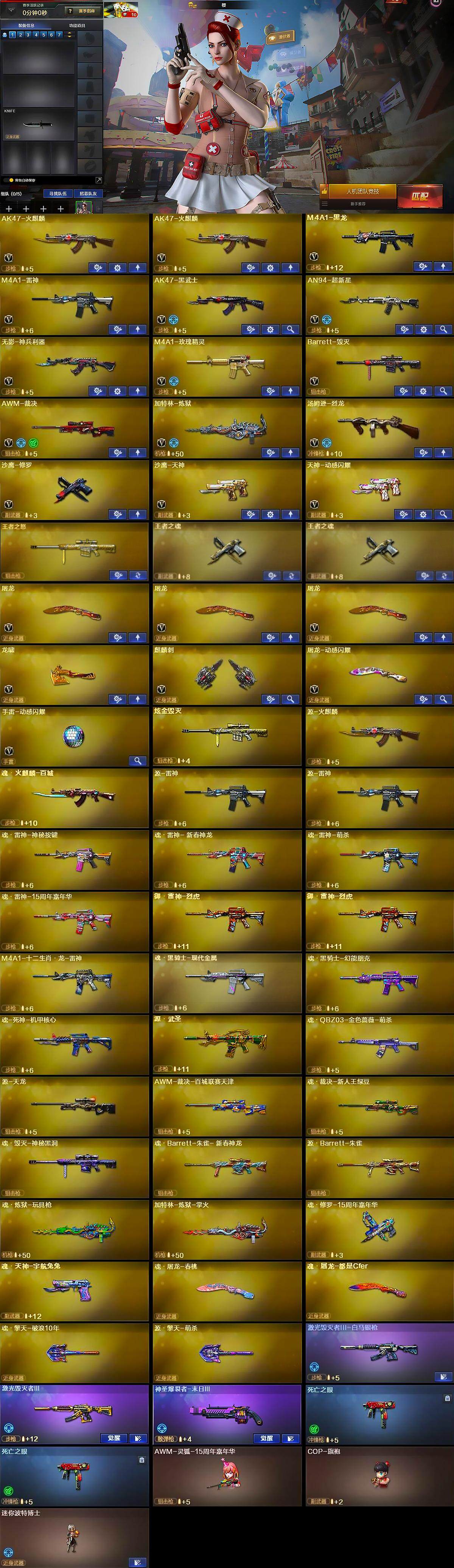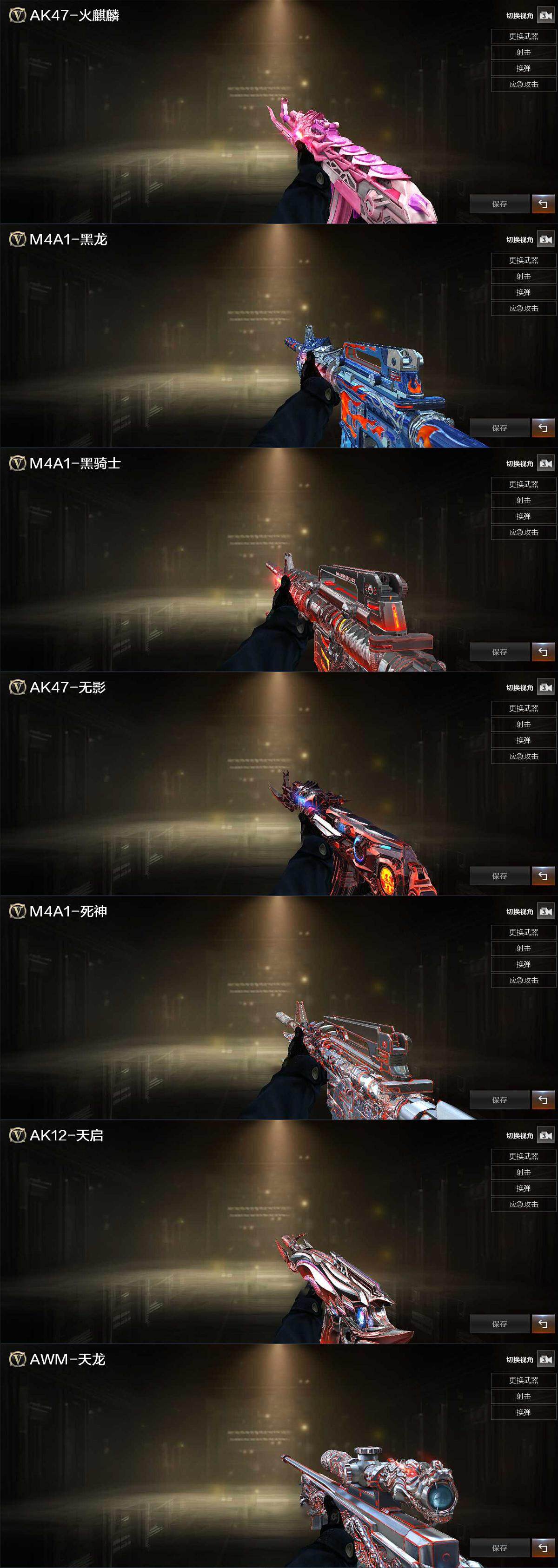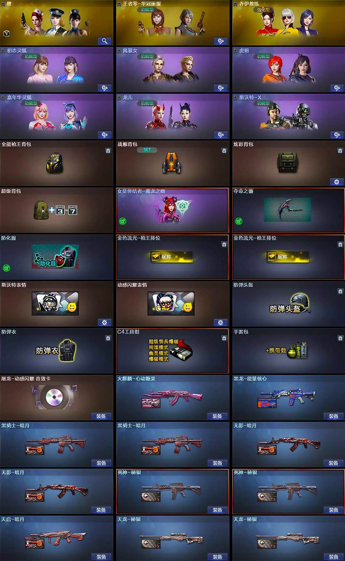 【英雄级武器】:AK47-火麒麟*2,M4A1-黑龙,M4A1-雷神,AK47-黑武士,AN94-超新星,无影-神兵利器,M4A1-玫瑰精灵,Barrett-毁灭,AWM-裁决,加特林-炼狱,汤姆逊-烈龙,沙鹰-修罗,沙鹰-天神,天神-动感闪耀,屠龙*3,龙啸,麒麟刺,屠龙-动感闪耀,手雷-动感闪耀