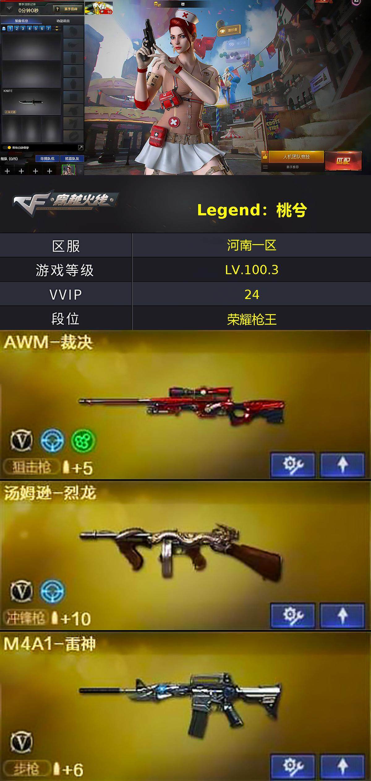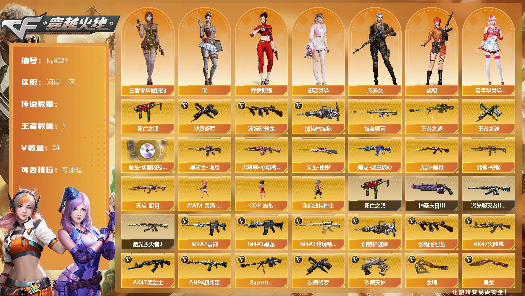 [15249072]河南一区-24V-3王者-1炫金 【热门武器】:死亡之眼*2,汤姆逊-烈龙,加特林-炼狱,沙鹰-修罗 【王者炫金武器】:王者之怒,王者之魂*2,炫金毁灭 【音效卡】:屠龙-动感闪耀 音效卡 【皮肤】:火麒麟-心动糖果,黑龙-能量核心,黑骑士-暗月*2,无影-暗月*2,死神-秘银*2,天启-暗月,天龙-秘银*2 【角色】:樱,王者零-华冠丽服,乔伊教练,初恋灵狐,风暴女,虎妞,嘉年华灵狐,龙儿,斯沃特-X 【人偶武器】:AWM-灵狐-15周年嘉年华,COP-旗袍,迷你波特博士 【暴走生化】:死亡之眼*2 【挑战大师】:激光毁灭者III-白马银枪,激光毁灭者III,神圣爆裂者-末日III 【英雄级武器】:AK47-火麒麟*2,M4A1-黑龙,M4A1-雷神,AK47-黑武士,AN94-超新星,无影-神兵利器,M4A1-玫瑰精灵,Barrett-毁灭,AWM-裁决,加特林-炼狱,汤姆逊-烈龙,沙鹰-修罗,沙鹰-天神,天神-动感闪耀,屠龙*3,龙啸,麒麟刺,屠龙-动感闪耀,手雷-动感闪耀 【道具】:全能枪王背包,战舰背包,炫彩背包,超级背包,女皇终结者-魔龙之吻,夺命之镰,防化服,金色流光-枪王排位*2,斯沃特表情,动感闪耀表情,防弹头盔,防弹衣,C4工具钳,手雷包 【特殊枪械】:1烈龙,1炼狱