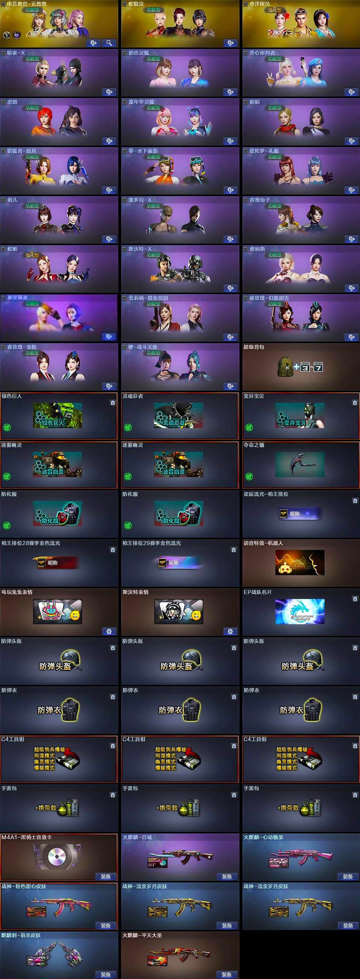 【角色】:电竞教官-云悠悠,蛇隐宗,奇洋探员,暗夜-X,初恋灵狐,芳心审判者,虎妞,嘉年华灵狐,娟娟,猎狐者-追月,0号玩家,零-水下丽影,曼陀罗-礼服,萌儿,潘多拉-X,青霞仙子,蛇姬,斯沃特-X,兔囡囡,维纳斯,新灵狐者,雪莉杨-摸金校尉,夜玫瑰-幻能朋克,夜玫瑰-宠粉,樱-战斗天使