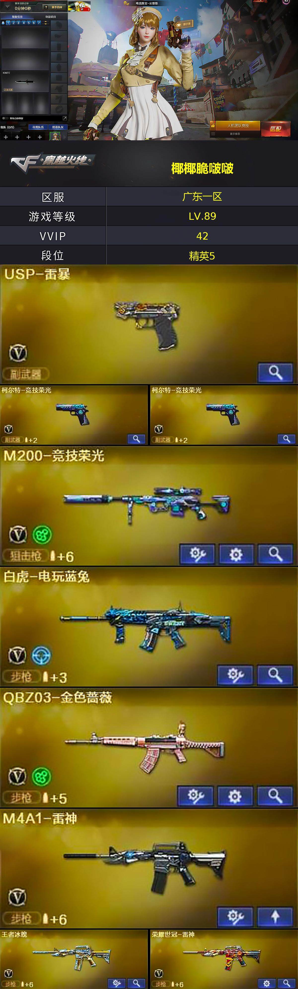 [15249136]广东一区-41V-6王者-2炫金 【热门武器】:QBZ03-金色蔷薇,HK417-朱雀,M200-竞技荣光,荣耀世冠-雷神,白虎-电玩蓝兔,M4A1-黑骑士,加特林-炼狱,USP-雷暴 【王者炫金武器】:王者龙血,炫金武士,炫金修罗 【音效卡】:M4A1-黑骑士音效卡 【皮肤】:火麒麟-平天大圣,火麒麟-百城,火麒麟-心动糖果,战神-粉色甜心皮肤,战神-流金岁月皮肤*2,AK47-B-常胜将军-曹操,AK47-B-常胜将军-刘备*2,AK47-B-常胜将军-孙权,麒麟刺-萌杀皮肤 【角色】:电竞教官-云悠悠,蛇隐宗,奇洋探员,暗夜-X,初恋灵狐,芳心审判者,虎妞,嘉年华灵狐,娟娟,猎狐者-追月,0号玩家,零-水下丽影,曼陀罗-礼服,萌儿,潘多拉-X,青霞仙子,蛇姬,斯沃特-X,兔囡囡,维纳斯,新灵狐者,雪莉杨-摸金校尉,夜玫瑰-幻能朋克,夜玫瑰-宠粉,樱-战斗天使 【人偶武器】:M4A1-雷神-精英刀锋,AWM-灵狐-15周年嘉年华,海滩汪汪-巴雷特,COP-旗袍,迷你深渊冰龙,迷你牛魔王,迷你波特博士,夺魂,生化手雷-机甲核心*2,深渊终结者手雷*2,AK47-斯沃特,迷你超能女侍,迷你巨石泰坦-魔花研究所 【暴走生化】:超级对讲机 【挑战大师】:冰龙粉碎者-白马银枪*2,激光毁灭者III-白马银枪,神圣爆裂者-末日III*2 【英雄级武器】:AK47-麒麟,M4A1-雷神,M4A1-黑骑士,AN94-超新星,HK417-朱雀,无影-神兵利器,M4A1-玫瑰精灵,QBZ03-金色蔷薇,王者之戮-觉醒版*2,AK-47-猩红传说*6,王者冰魄-觉醒版,王者龙血-觉醒版,白虎-电玩蓝兔,荣耀世冠-雷神,M200-竞技荣光,加特林-炼狱,悦蓝-惊涛骇浪-觉醒版,USP-雷暴,柯尔特-竞技荣光*2,麒麟刺*3,擎天-竞技荣光*4,高爆手雷-竞技荣光*3,闪光弹-竞技荣光,烟雾弹-竞技荣光*4,烟雾弹-古蛇迷踪 【道具】:超级背包,绿色巨人,灵魂忍者,变异宝贝,迷雾幽灵*2,夺命之镰,防化服*2,星辰流光-枪王排位,枪王排位28赛季金色流光,枪王排位29赛季金色流光,语音特效-机器人,电玩兔兔表情,斯沃特表情,EP战队名片,防弹头盔*3,防弹衣*3,C4工具钳*3,手雷包*3 【特殊枪械】:1黑骑士,1炼狱