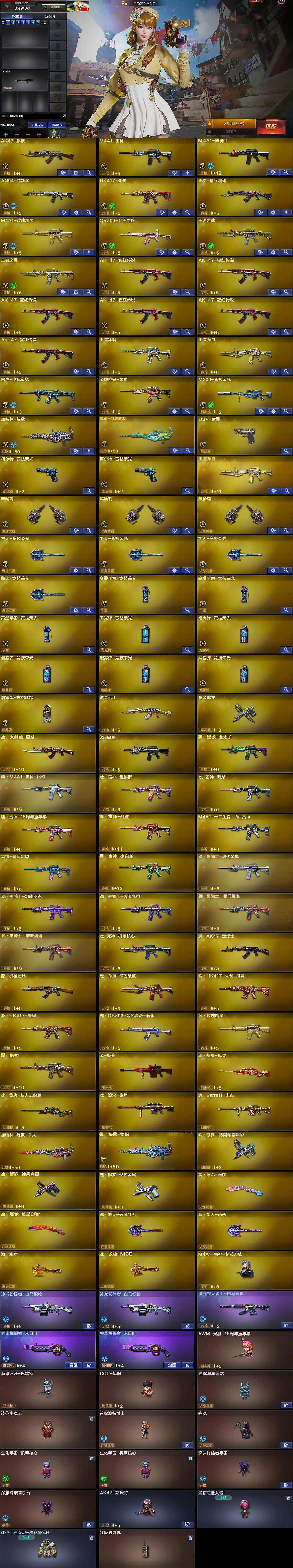 【英雄级武器】:AK47-麒麟,M4A1-雷神,M4A1-黑骑士,AN94-超新星,HK417-朱雀,无影-神兵利器,M4A1-玫瑰精灵,QBZ03-金色蔷薇,王者之戮-觉醒版*2,AK-47-猩红传说*6,王者冰魄-觉醒版,王者龙血-觉醒版,白虎-电玩蓝兔,荣耀世冠-雷神,M200-竞技荣光,加特林-炼狱,悦蓝-惊涛骇浪-觉醒版,USP-雷暴,柯尔特-竞技荣光*2,麒麟刺*3,擎天-竞技荣光*4,高爆手雷-竞技荣光*3,闪光弹-竞技荣光,烟雾弹-竞技荣光*4,烟雾弹-古蛇迷踪